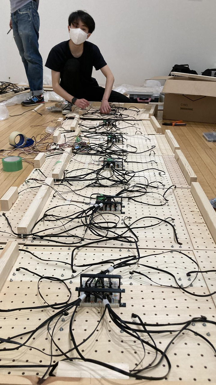 インスタレーション作品水の音色をユニットで制作しました。公募規定により、ユニットでの参加ができず、テクニカルとして明記しています。 安らかな水中の音と水面を表現するインスタレーション、構成要素のファンにはジャンク品を用いています。海の景色の裏には電子廃棄物の問題が強固に結びついており、消費社会や、スペック至上主義の問題は個人個人が当事者の問題であると考えます。一方で、海の景色や音色に心地よさを感じ、海からは落ち着きを感じ、心を穏やかにしてくれていると思います。本作品では、この二面性を表現することを目指しました。 プロトタイプとして、リンク機構を用いた装置の開発、センシングのためのUnity製スマホアプリ、センシングした加速度の解析等約三ヶ月かけて制作を行いました。 特にPCファンを用いたインスタレーションという形に決まってからは低速な回転を表現するためにトランジスタによる電流制御、二段階の回転制御、18列のファンに対する制御など複雑な処理を実行しました。 この制作ではユニットで共に制作する難しさと、作品に対するアイデアの交換など、これまで個人で開発することの多かった自分にとって協力して制作する際のコミュニケーションやオーナーシップについて学ぶことができました。 https://github.com/mimocaeye