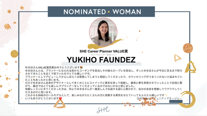 女性向けキャリアスクール「SHElikes」の体験レッスンにて、個別カウンセリングや入会案内を担当しました。キャリアに悩むお客様がポジティブな気持ちで将来に向き合えるよう、信頼関係を大切にした寄り添い型のコミュニケーションを心がけました。