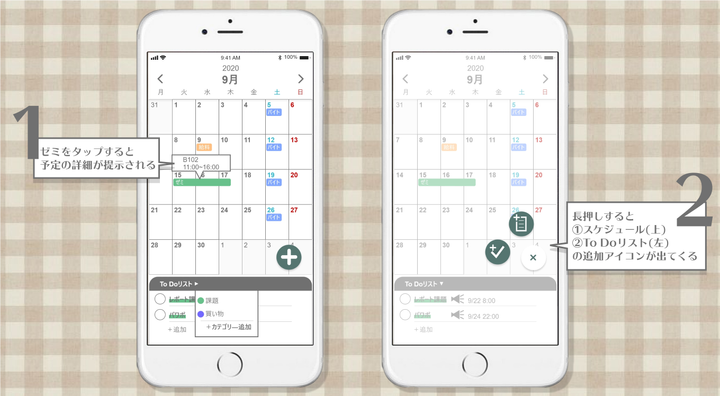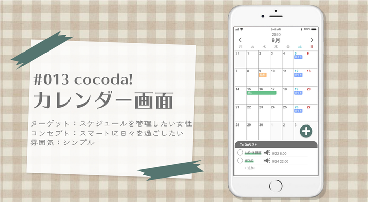 【構想】 Lifebearを利用しているので、トレースしつつデザインを変更しました。 Lifebear→(L) Original→(O) ・(L)上下スライドで月の変更→(O)横スライド ・(L)カレンダー表示方法(月、週、日)→(O)カレンダーの表示は月のみ ・(L)画面下にアイコンがある→(O)プラスアイコンで追加アイコンをまとめた ・(L)To Doリストは表示されていない→(O)To Doリストを表示