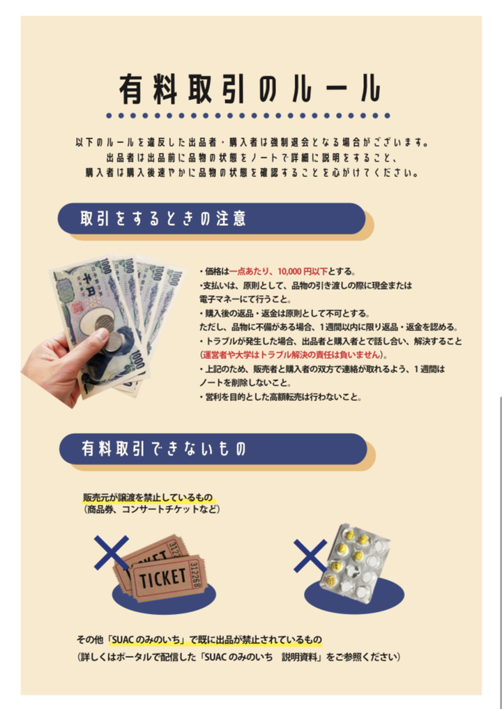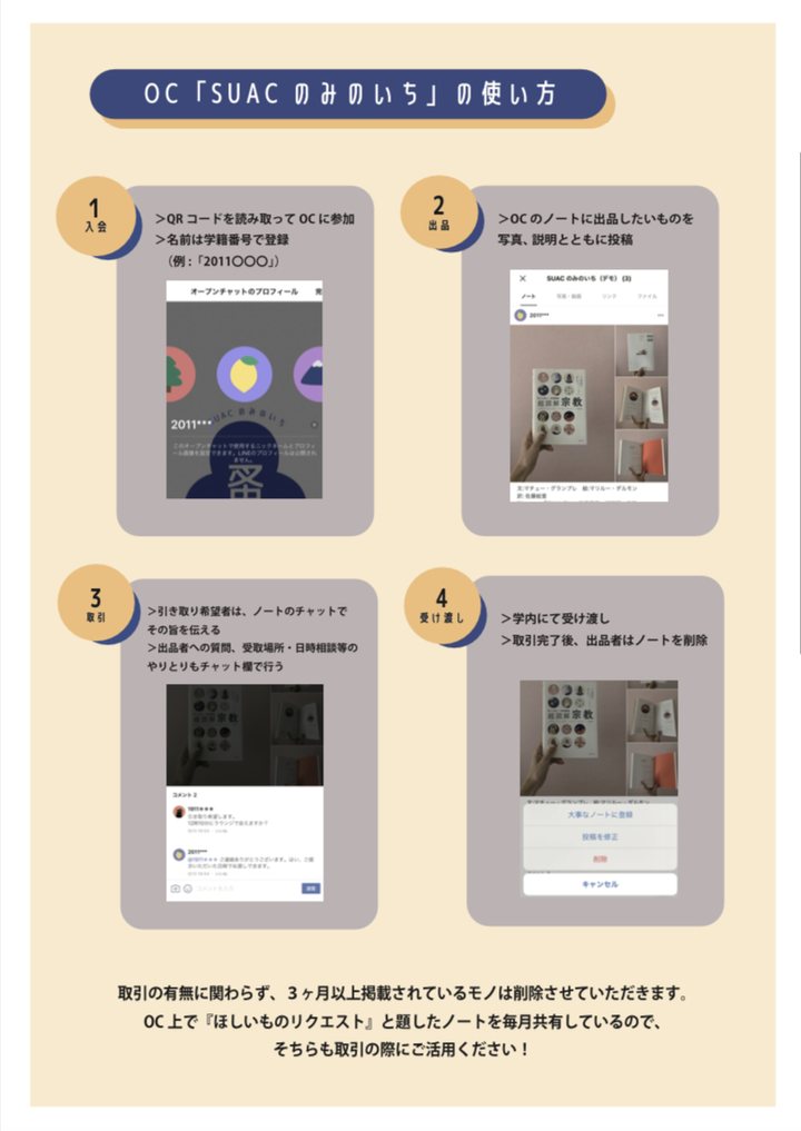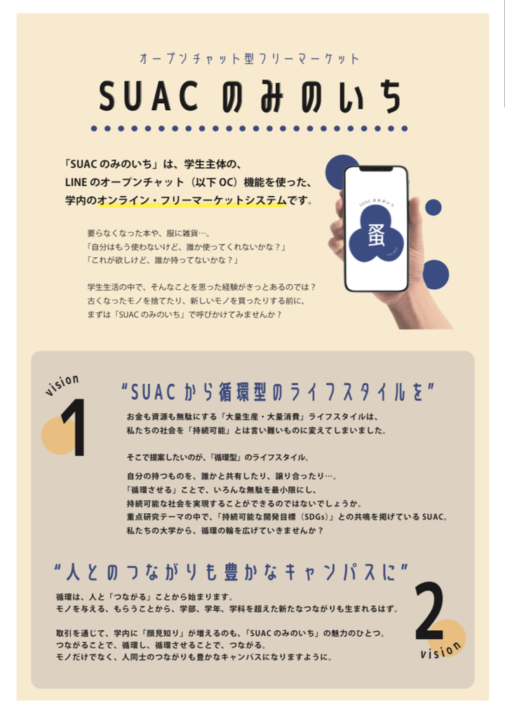 「人とつながることで循環する」ことをコンセプトにした「SUACのみのいち」というLINEのオープンチャット(OC)システムを利用したオンラインフリーマーケットを期間限定で運営。 毎回新学期を迎えるたびに、Twitter上で「〇〇の教科書もってますか?」「これいりませんか?」のTweetが上がっているのを見て、このやりとりを一元化できるプラットフォームをつくって、マッチングができないかと思いたち、始動。 開始から半年弱で、常時170人ほどがOCに所属、システムを利用してくれるようになった。 企画立案からロゴ・プロジェクトデザイン、立ち上げまで1人で行ったが、違う学科や学年の学生もこの取り組みに興味を持ってくれ、チーム体制での管理も出来るように。6ヶ月間の試験運用ではあったが、学内に「循環」「リユース」の概念を広めることができた。