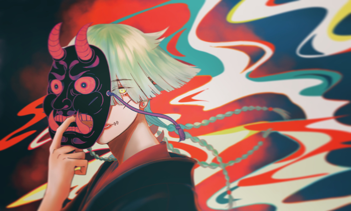 鬼の面をイメージしてキャラクターを考えました。 こだわりポイントは鬼のお面です。