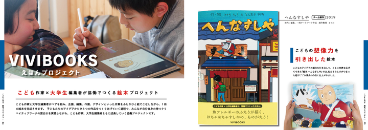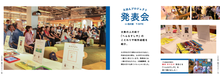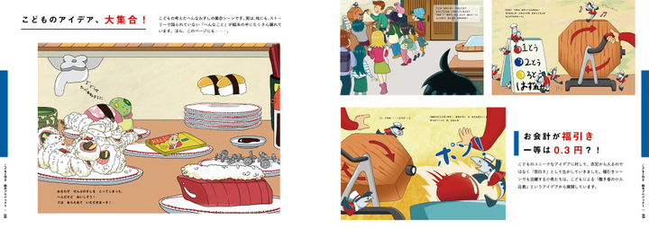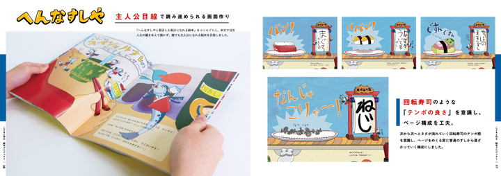 <チーム制作>子供と大学生が2人でペアを組み、一冊の絵本をつくるというプロジェクトで、編集・一部アートワーク担当として参加しました。子供の豊かで時に難解なアイデアを否定から入るのではなく、面白さとして生かしていきました。完成した「へんなすしや」は、子供のアイデアがたくさん詰まった、唯一無二の絵本として仕上がり、大勢の編集者の方、プロの絵本作家、一般の方に向けて発表しました。