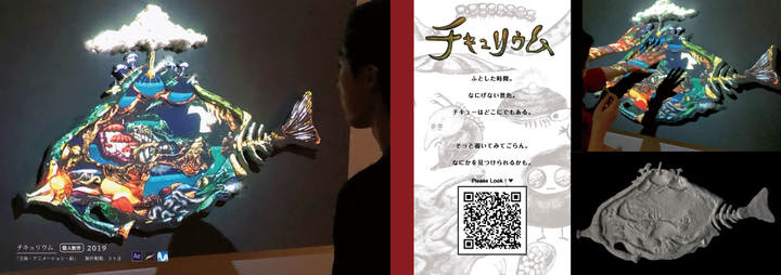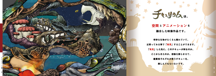 <個人制作> チキュリウムは、キャラクターアニメーションと音楽が流れた空間を融合させた映像作品です。奇妙な生物がたくさん隠れていて、近寄ってみる事で「発見」することができます。 「発見」した先に、このチキューが何なのか、どこからきたのか、想像を膨らませて、鑑賞者それぞれが思うチキューを、楽しんでもらいたいです。