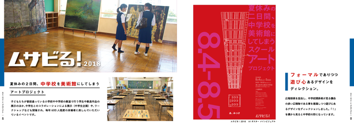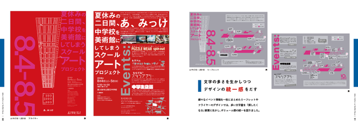 <チーム制作>夏休みの二日間、中学校を美術館にしてしまうアートプロジェクト、ムサビる!では、大学一年次、広報部として参加し、2年次には広報部長を務め、ポスターやリーフレット、フライヤーのデザインディレクションを務めました。中学校に関わる人が見る機会の多い広報物である事を意識し、フォーマルでありつつ 発見要素を取り入れた遊び心のあるデザインを心がけました。
