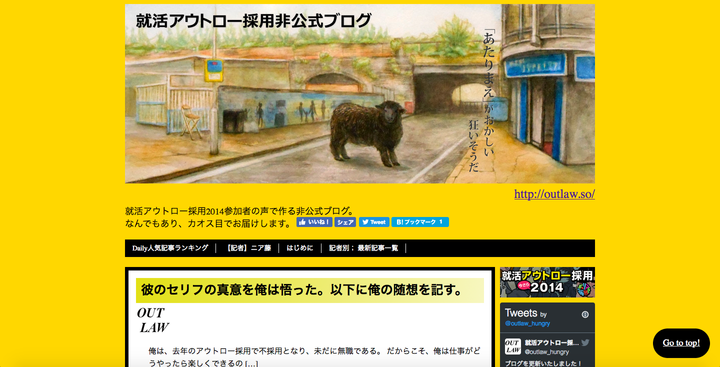 アウトロー採用2014参加時、友人と一緒に立ち上げたブログ。 行った作業はcssカスタマイズ、phpテーマファイル編集など。 ライターとしても活動していました。