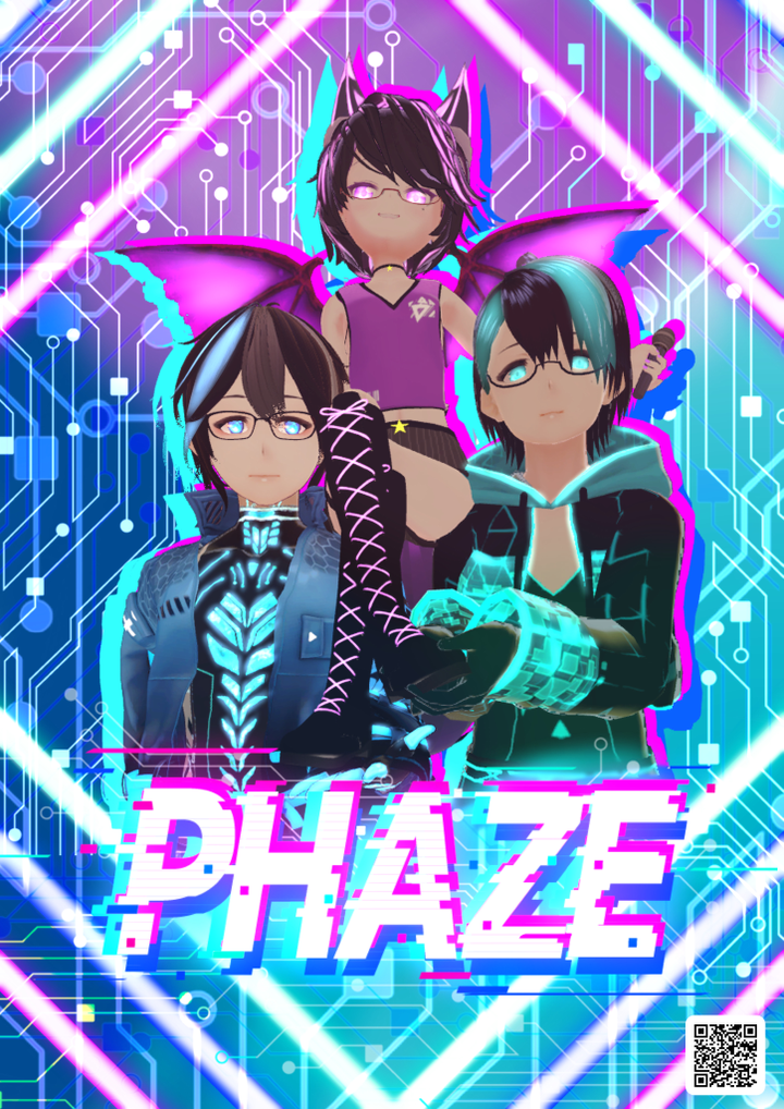 PHAZEというVRChatを活動の拠点としているインディーズバンドのポスターを制作しました。 あらかじめ指定されていたサイバー感をメインにネオンや、グリッジ、基盤模様などを配置し、メンバーそれぞれのカラーを使用したネオンやグリッジを表現しました。 制作時期:2021年5月 制作期間:8時間 使用ツール:illustrator、Medibangpaint