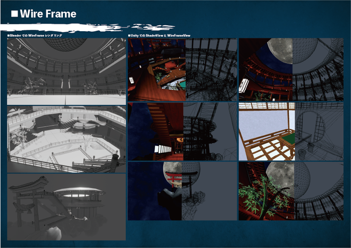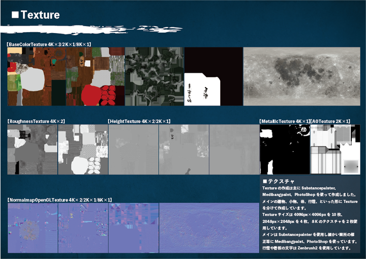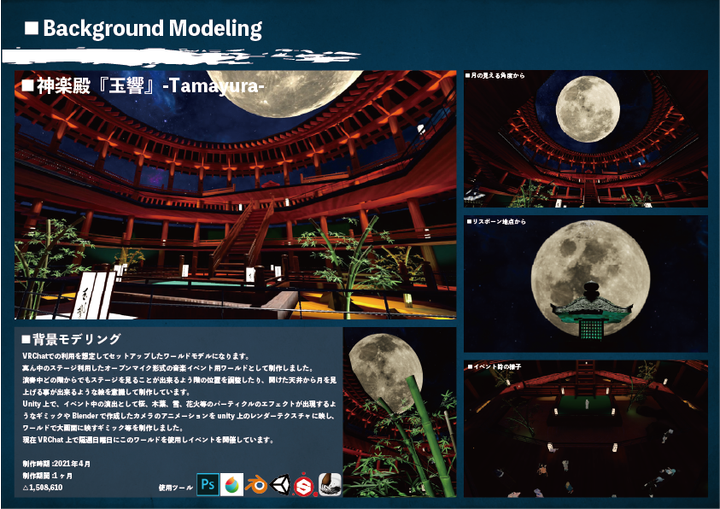 VRChatでの利用を想定してセットアップしたワールドモデルになります。真ん中のステージ利用したオープンマイク形式の音楽イベント用ワールドとして制作しました。 演奏中どの階からでもステージを見ることが出来るよう階の位置を調整したり、開けた天井から月を見上げる事が出来るような絵を意識して制作しています。 Unity上で、イベント中の演出として桜、木葉、雪、花火等のパーティクルのエフェクトが出現するようなギミックやBlenderで作成したカメラのアニメーションをunity上のレンダーテクスチャに映し、ワールドで大画面に映すギミック等を制作しました。現在VRChat上で隔週日曜日にこのワールドを使用しイベントを開催しています。 Textureの作成は主にSubstancepainter、Medibangpaint、PhotoShopを使って作成しました。メインの建物、小物、岩、行燈、といった形にTextureを分けて作成しています。Textureサイズは4096px×4096pxを10枚、2048px×2048pxを4枚、8Kのテクスチャを2枚使用しています。 メインはSubstancepainterを使用し細かい箇所の修正等にMedibangpaint、PhotoShopを使っています。行燈や看板の文字はZenbrush2を使用しています。 制作時期:2021年4月 制作期間:1ヶ月 △1,508,610