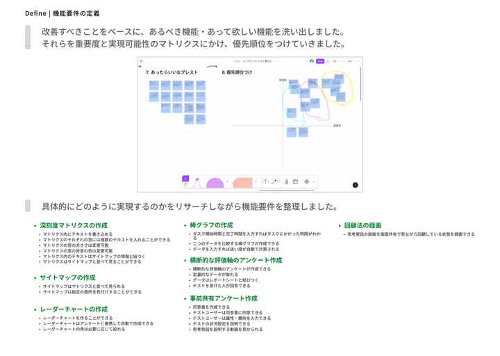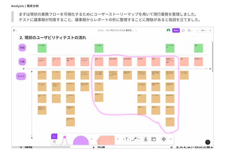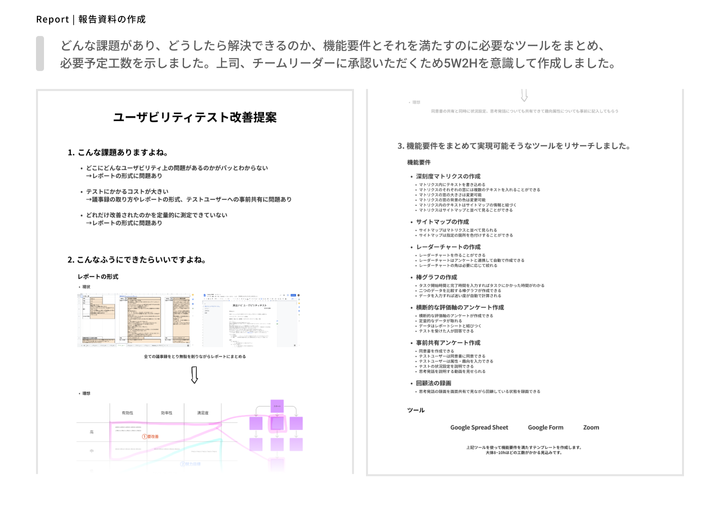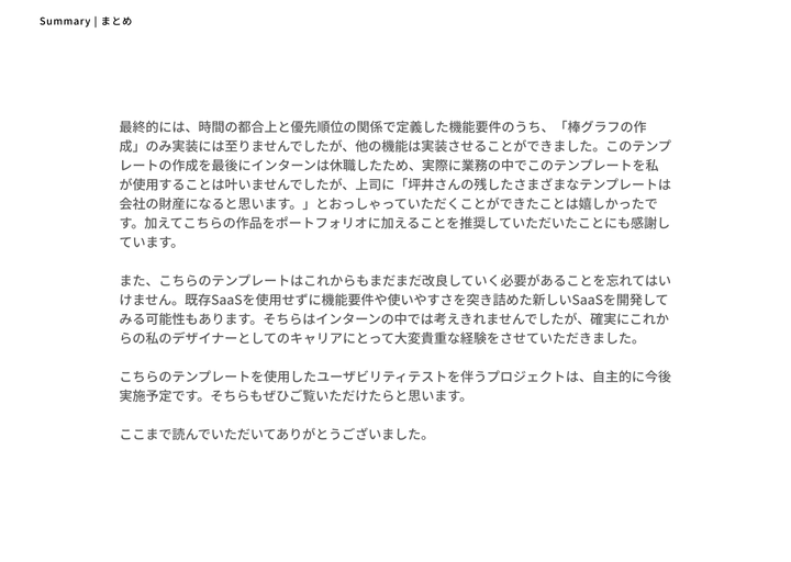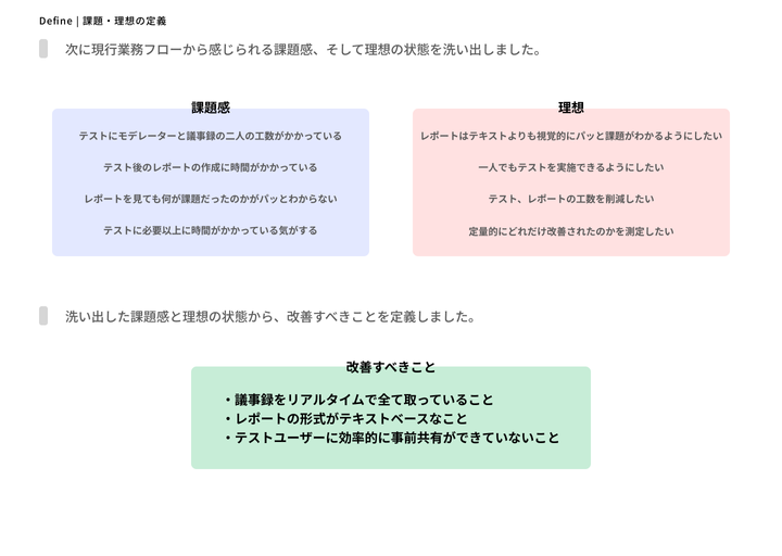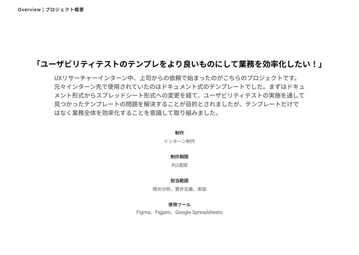 UXリサーチャーとしてインターンさせていただいている間に制作しました。 ユーザビリティテスト業務を効率的に、課題の特定を簡単にすることを目的に、課題の特定から要件定義、実装までを担当しました。 こちらのテンプレートを用いたユーザビリティテストも別の作品で実施予定です。