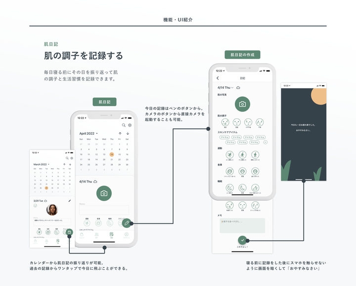 自分や自分の大切な人が使いたくなるようなアプリを作りたいとの思いから制作を始めました。 振り返って これまで知識としてばかりUIの作り方を学んでいましたが、初めて何もないところからアプリを考案するという実践の中でアプリのUIデザインを学ぶことができました。 この制作を通して、自分がなぜデザインをやりたいのか、どんなデザインをやりたいのかについても考えさせられました。