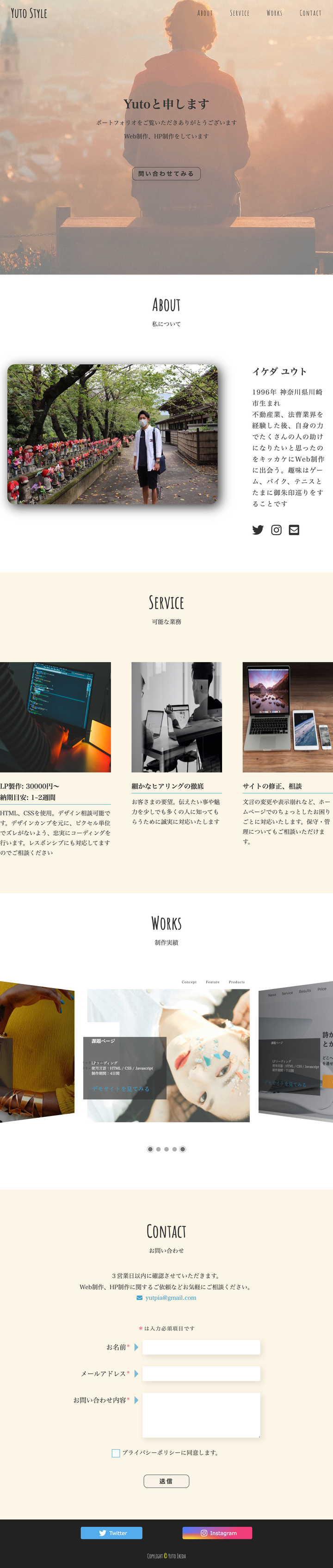 使用言語:HTML/CSS/jQuery 制作期間:4日 プログラミングスクールで学んだことを活かして、何か作ろうと思い作成したものになります。 制作実績のデモサイトリンクには、過去にデザインカンプからコーディングして作成したサイトを画像で掲載してます。 こだわった部分:swiper.jsをカスタマイズして、その上に制作物の内容を記載したかったのですが、opacityが文字にも被ってしまったので、被さないように実装しました。 またGoogleFormとの紐付け、レスポンシブサイズの表示も見やすいように調整しました