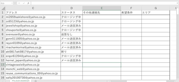 Yahooのアカウント名は「@yahoo.co.jp」を付けるとメールアドレスになりますが、PythonでSeleniumとPandasを使い、ヤフオクからアカウント名をスクレイピングするコードを書きました。 きっかけは引っ越しをした際にトランクルームを利用する機会があったのですが、 以前オークションなどの出品をしている知人が「商品が部屋に溢れちゃうんだよね」と言っていたことを思い出し、 ヤフオクで出品する方をターゲットに「トランクルーム契約しませんか?」とメールを送るリスト作成を自動化するプログラムを作ってみようとコードを書いてみました。 作成当時はPandasの勉強途中だったため、Excelで追加カラムを作成しております。 ■ポイント ①工数の大幅な削減 人力でアカウントをリストを転記するとなると果てしない工数がかかりますが、上記の方法なら数分で済みます。 試しに10ページ分(1000件)を比較・計算してみたのですが、 人力⇒2.8時間、 自動化⇒0.09時間(約5分)、 約2.7時間の工数削減が出来ます。 ②作業の正確性 人力で転記した場合、人によると思いますが数100件に1件程ミスが出ることが想定されます。 自動化で行う場合は件数が増えてもミスは0件のまま正確性を担保できます。 記述コードなど詳細について、ご質問頂ければメッセージや面談でご説明いたしますのでご検討下さい。