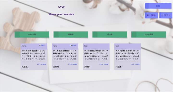テストユーザー name: test mail: test@test password: testtest ・開発環境 Ruby : 2.5.1 Rails : 5.2.4.1 DB : MySQL AWS ・概要 日頃の悩みや困りごとを書き出すアプリです。 他者と共有することで、自分では解決できないことを、他者が解決するきっかけにできることを目的としています。 軽い気持ちで書き出してほしい思いから、全体的な仕様を”付箋”をテーマに作成しています。 ・開発コンセプト 社会が発展しているが、まだまだユーザー目線でないことが多いと感じます。 不満をただ愚痴で終わらせるだけではなくて、本気で解決できないかという着眼点から開発に取り掛かりました。 一人、また、技術者でない人間は、自分で解決するのが難しい問題も、他者と共有することで、別の誰かが解決してくれる可能性を見いだすことができるはずだと考えました。 メリットは、投稿を見て、既存サービスが改善すれば現ユーザーは単純に幸福になりますし、新規サービスの立ち上げであれば、現ユーザーだけでなく、新規サービスを立ち上げた側の踏み切るきっかけにも、また、ビジネスチャンス発見の一助にもなれると考えています。