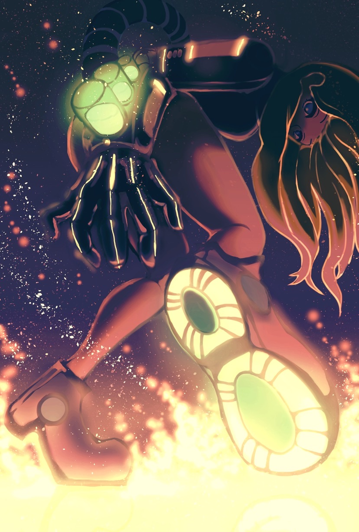 火山にしかない珍しい鉱石を求めてやってきたサイボーグ女。耐火性能が備わっていてマグマの中も問題ない。無事、鉱石を見つけ持ち帰る途中に落としてしまった一枚イラスト。