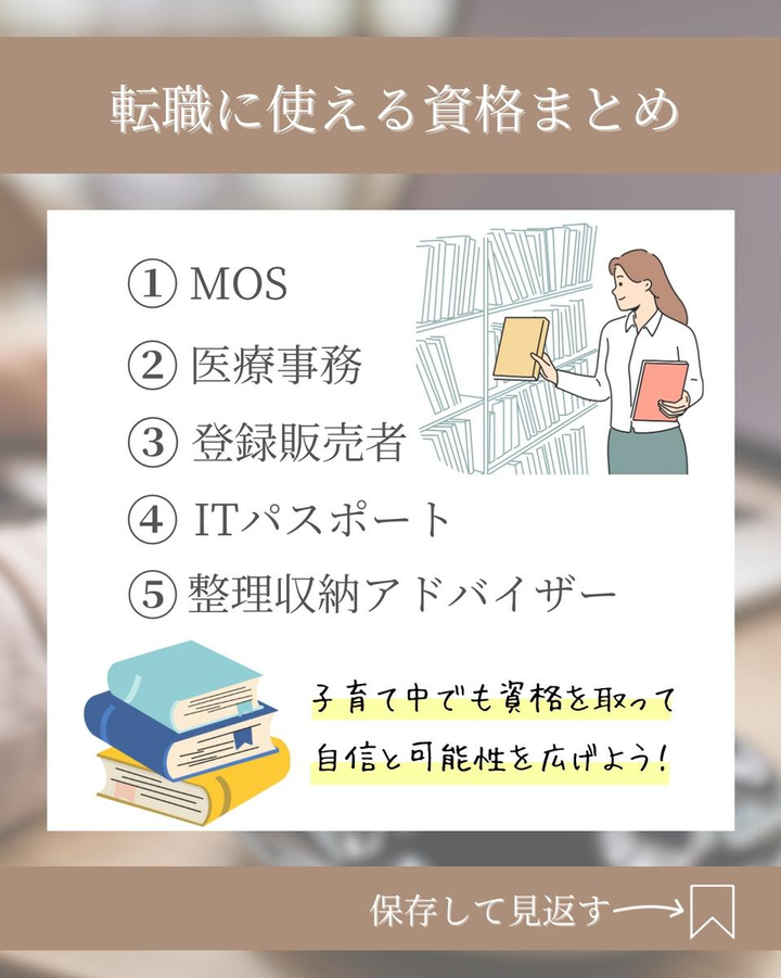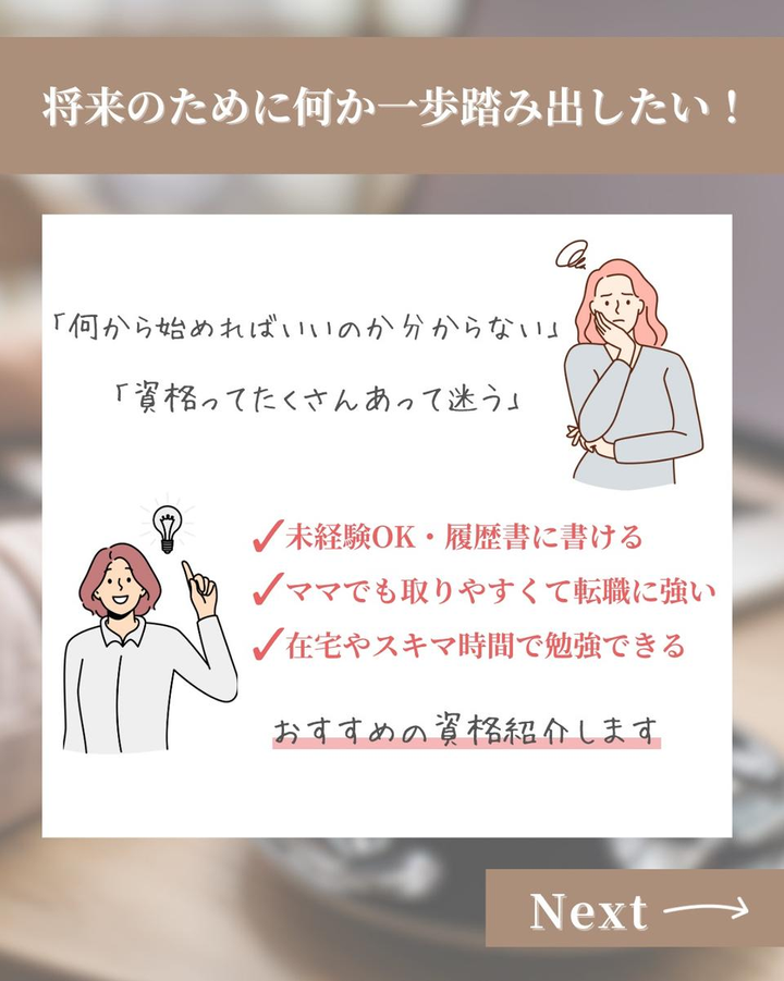 子育て中の20〜40代女性をターゲットとし、需要のあるテーマで構成。 2枚目で不安や迷いに寄り添いながら資格選びのポイントを提示し、読むハードルを下げる工夫をした。 3枚目はオススメ資格5つを簡潔に紹介し、実際の行動に繋がるようまとめた。優しいカラーをベースに使用し、ターゲットの共感を大事に制作した。