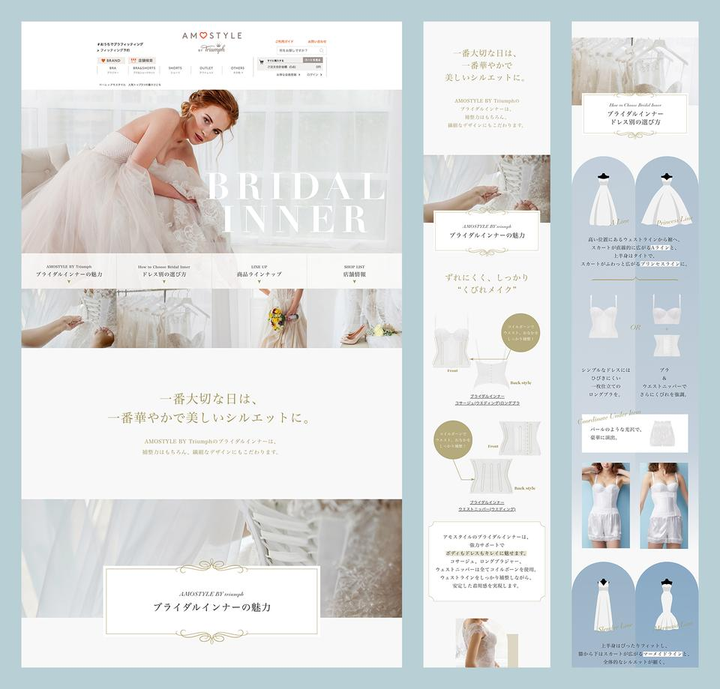 世界中で展開する下着メーカーtriumph(トリンプ)のブランド「AMO STYLE」。 AMO STYLEから展開しているブライダルインナーのコレクションページを作成しました。 サイト内で使用しているイラストも私が作成しています。