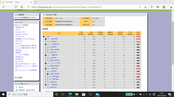 大学1年生頃から、3年生までに卒業に必要な単位数を9割取る事を目標に活動していました。結果として単位をほぼ落とすことなく、目標を達成しました。(不合格となっている単位の半分はゼミです。その他の単位は4年生で取得します。)
