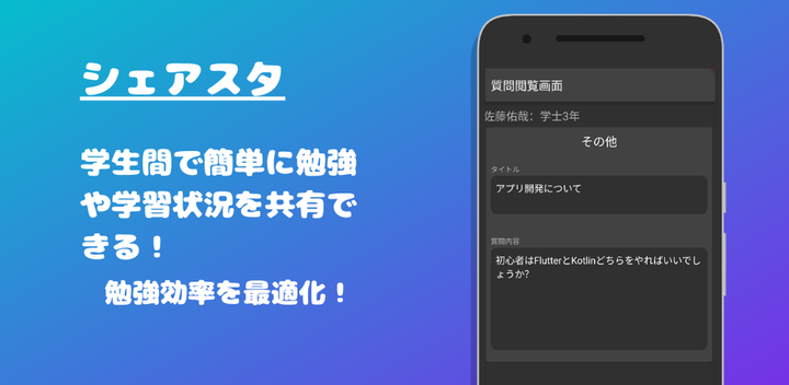 シェアスタは、学生がテキスト上で勉強用のメッセージを共有することができるアプリです。 科目を選択し、メッセージを送信することで、全てのユーザーが閲覧することができます。 さらに、学年も共有されるため、上級生や先輩との交流を通して知識や情報を共有することができます。 背景と目的 ・コロナなどで教授や友達から教えてもらう機会が少ない ・岩手県立大学にある学習支援コーナーでも教えてもらうこともできるが、予約システムを使用したり、大学に向かう必要があるため、教えてもらうまでのハードルが高い。 この問題を解決するために、 この問題を解決するために、生徒間と勉強や学習状況を共有することで、学習効率の最適化を目指すのが目的となります。 機能 ・質問一覧と投稿 ・全てのユーザーが共有できるため、多くの情報を得ることが可能 ・学年も共有するため、上級生や先輩から多くの知識や情報を得ることが可能 ・科目ごとに分かれているため、必要な情報を探すのが容易 ・回答一覧機能と回答機能 ・コミュニケーションが活発化し、知識交換を通して学習効果が高まる ・ダークモード対応