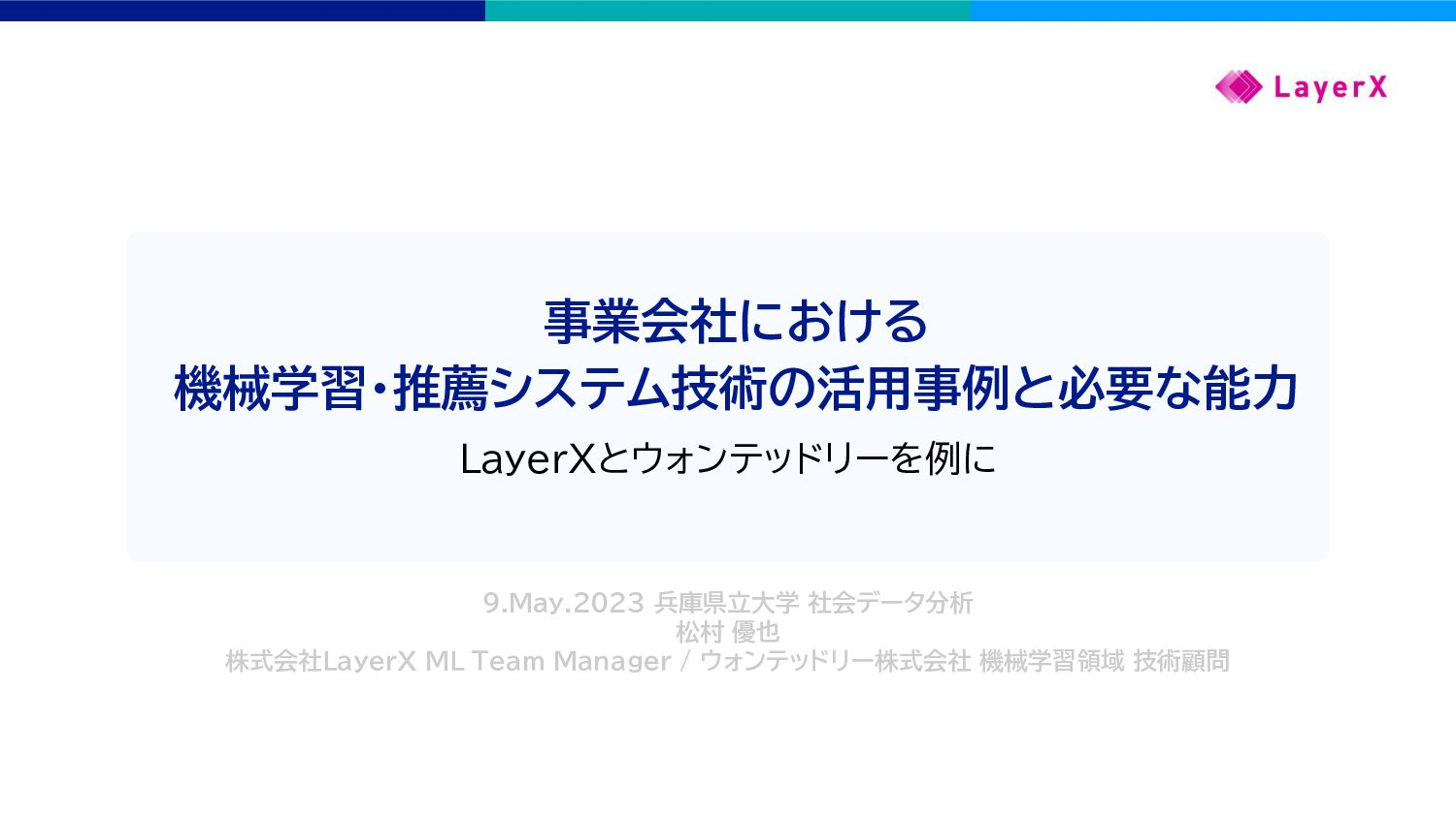2023年05月09日 の兵庫県立大学の社会データ分析という講義における講演資料です。 機械学習や推薦システムという技術が事業会社におけるプロダクト開発でどのように活用されているのか、それを実現するデータサイエンティストや機械学習エンジニアというのはどういう職種なのか、LayerXのバクラク請求書やウォンテッドリーのWantedly Visit の例を使って紹介しました。