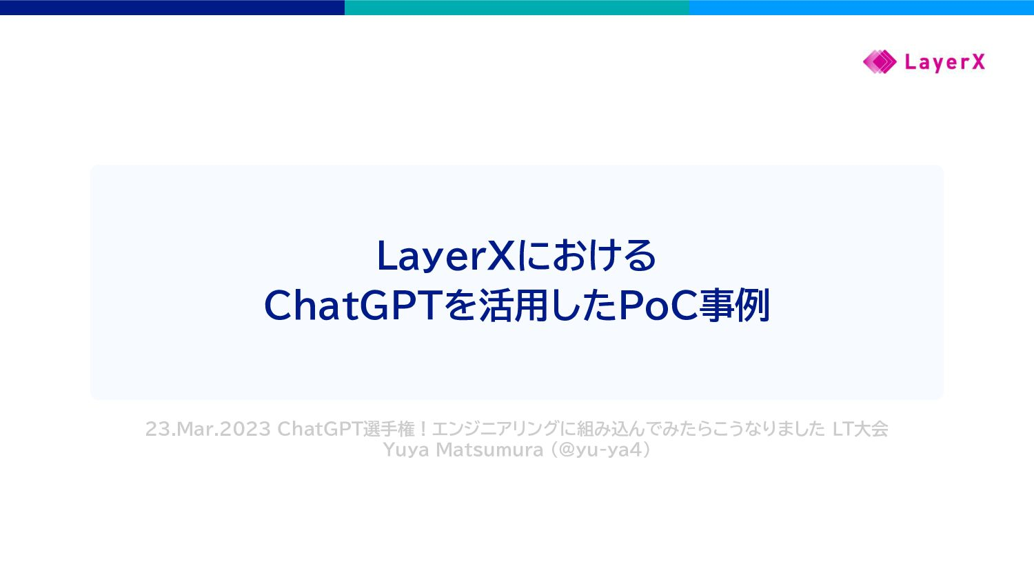 2023年3月23日 ChatGPT選手権!エンジニアリングに組み込んでみたらこうなりました LT大会 (https://findy.connpass.com/event/276736/) における5分LTの資料です。 機械学習技術を利用する必要があるようなPoCを誰でも・低コストで行えるようになったインパクトが大変大きいと感じています。その事例を簡単にいくつか紹介しました。
