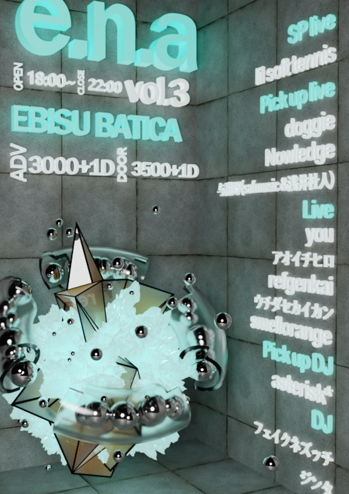 2022年10月14日にEBISU BATICAで行われた「e.n.a Vol.3」のフライヤー制作を行いました。使用ソフトはBlenderとPhotoshopです。