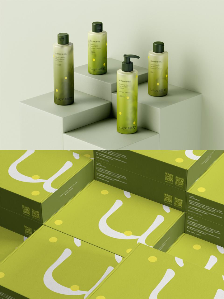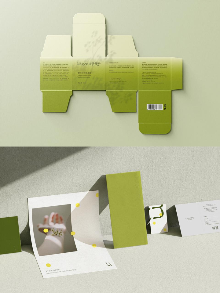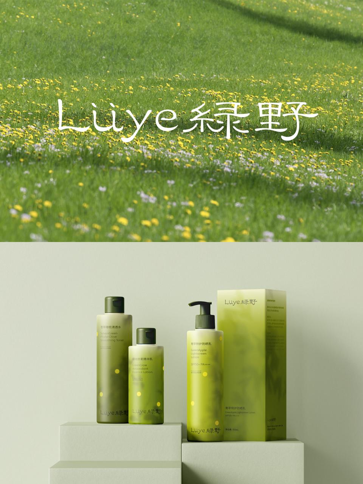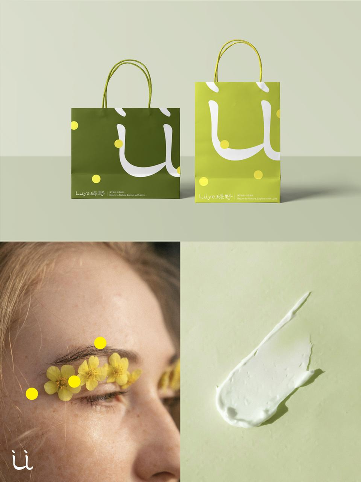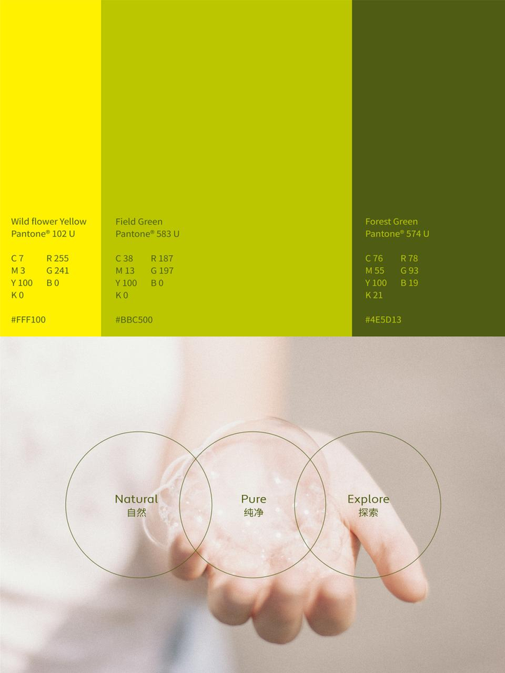 #Pure #Natural #Explore アウトドアシーンに特化した自然派スキンケアブランドのブランディング。ピンインを使って国際市場に向かうと自信を示したことに呼応して、曹全碑の特徴を吸収したロゴを制作し、「ü」をブランドシンボルとしました。自然の中で探索する時、偶然に野花に出会う楽しさを黄色のドットで表現しました。