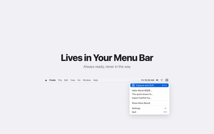スクリーンショットからテキストを抽出し、即座にコピーできる機能を実装しました。 ユーザーの作業効率向上を目的としたツールとして設計し、現在App Storeでのリリースに向けて申請を進めています。 ローカル処理を活用した軽量な設計や、シンプルで直感的なUIを意識して開発しました。