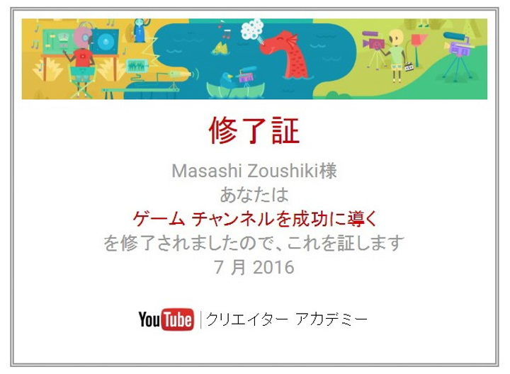 YouTubeブートキャンプ(ゲームチャンネル)終了証