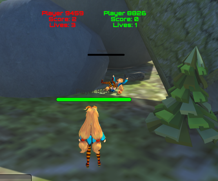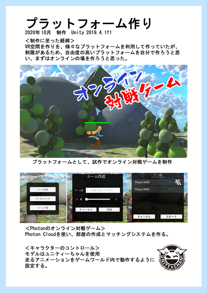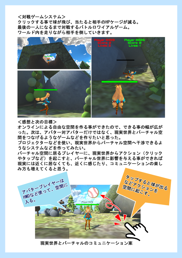 <制作に至った経緯> VR空間を作りを、様々なプラットフォームを利用して作っていたが、 制限があるため、自由度の高いプラットフォームを自分で作ろうと思 い、まずはオンラインの場を作ろうと思った。 プラットフォームとして、試作でオンライン対戦ゲームを制作。 <Photonのオンライン対戦ゲーム> Photon Cloudを使い、部屋の作成とマッチングシステムを作る。 <キャラクターのコントロール> モデルはユニティーちゃんを使用 走るアニメーションをゲームワールド内で動作するように 設定する。 <対戦ゲームシステム> クリックする事で球が飛び、当たると相手のHPケージが減る。 最後の一人になるまで対戦するバトルロワイアルゲーム。 ワールド内を走りながら相手を倒していきます。 <感想と次の目標> オンラインによる自由な空間を作る事ができたので、できる事の幅が広がった。 次は、アバター対アバターだけではなく、現実世界とバーチャル空間を つなげるようなゲームなどを作りたいと思った。 プロジェクターなどを使い、現実世界からバーチャル空間へ 干渉できるようなシステムなどを作ってみたい。 バーチャル空間に居るプレイヤーに、現実世界からアクション (クリックやタップなど)を起こすと、バーチャル世界に 影響を与える事ができれば現実には近くに居なくても、 近くに感じたり、コミュニケーションの楽しみ方も増えてくると思う。