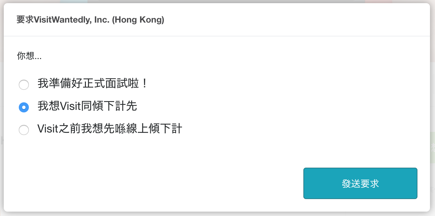 按下 “想Visit” 後,有三個選項表達你的興趣程度。其中一個為到訪該公司,你亦可選擇直接進行面試或先在網上交談。