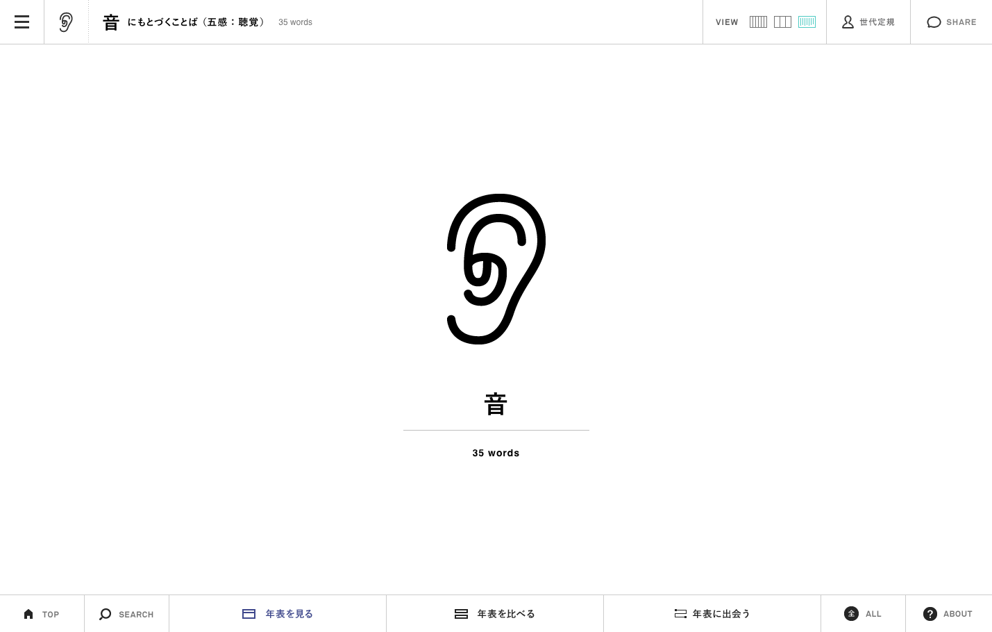 また通常の年表形式の他に、クロスワードのように次々とつながる「ことば」を眺められるトップページ、共通の文字を持つ「ことば」を次々と辿り、思わぬ「ことば」に出会える「Word to Words」異なる二種類の年表を比較して見られる「Side by Side」など、多様な視点から「ことば」を見ているうちに様々な気付きが生まれます。