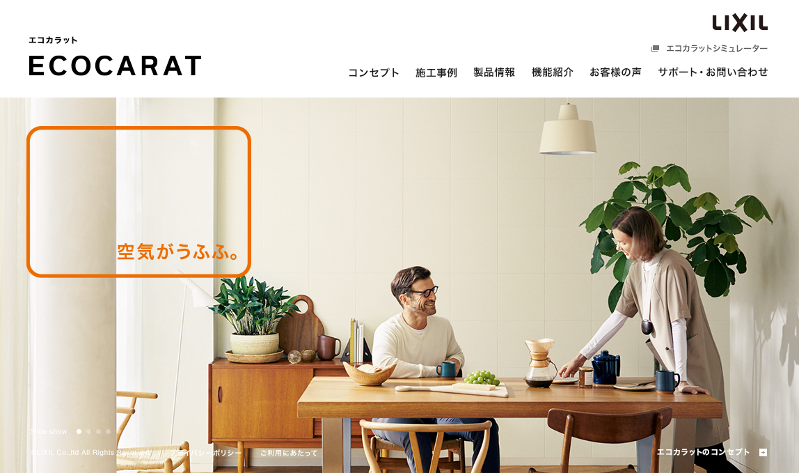 LIXILが開発した調湿タイルECOCARATのウェブサイトのディレクション・デザイン・制作をしています。数百種類の商品バリエーションを持つ商品を、画面が煩雑にならないように、すっきりとしたレイアウトにまとめ、見やすく清潔感のある印象をつくっています。