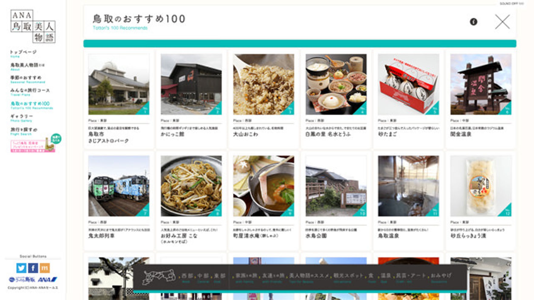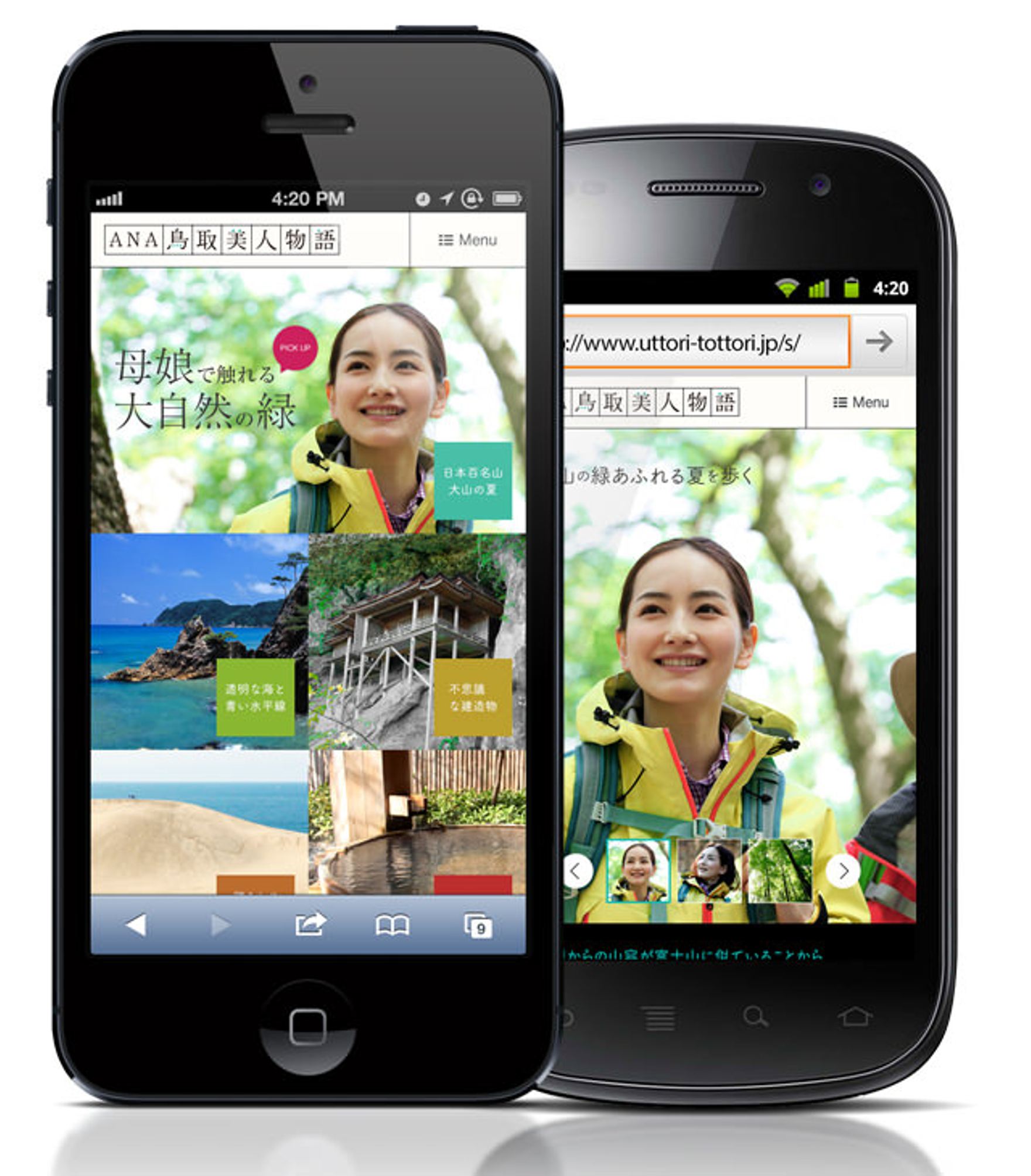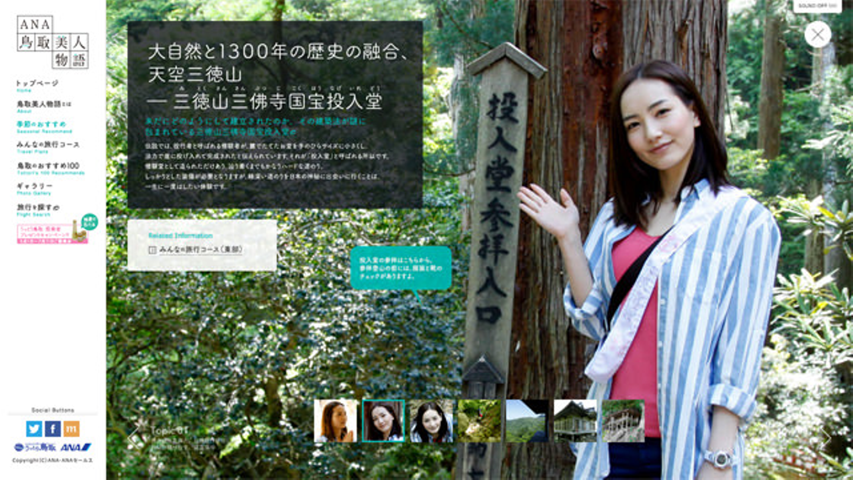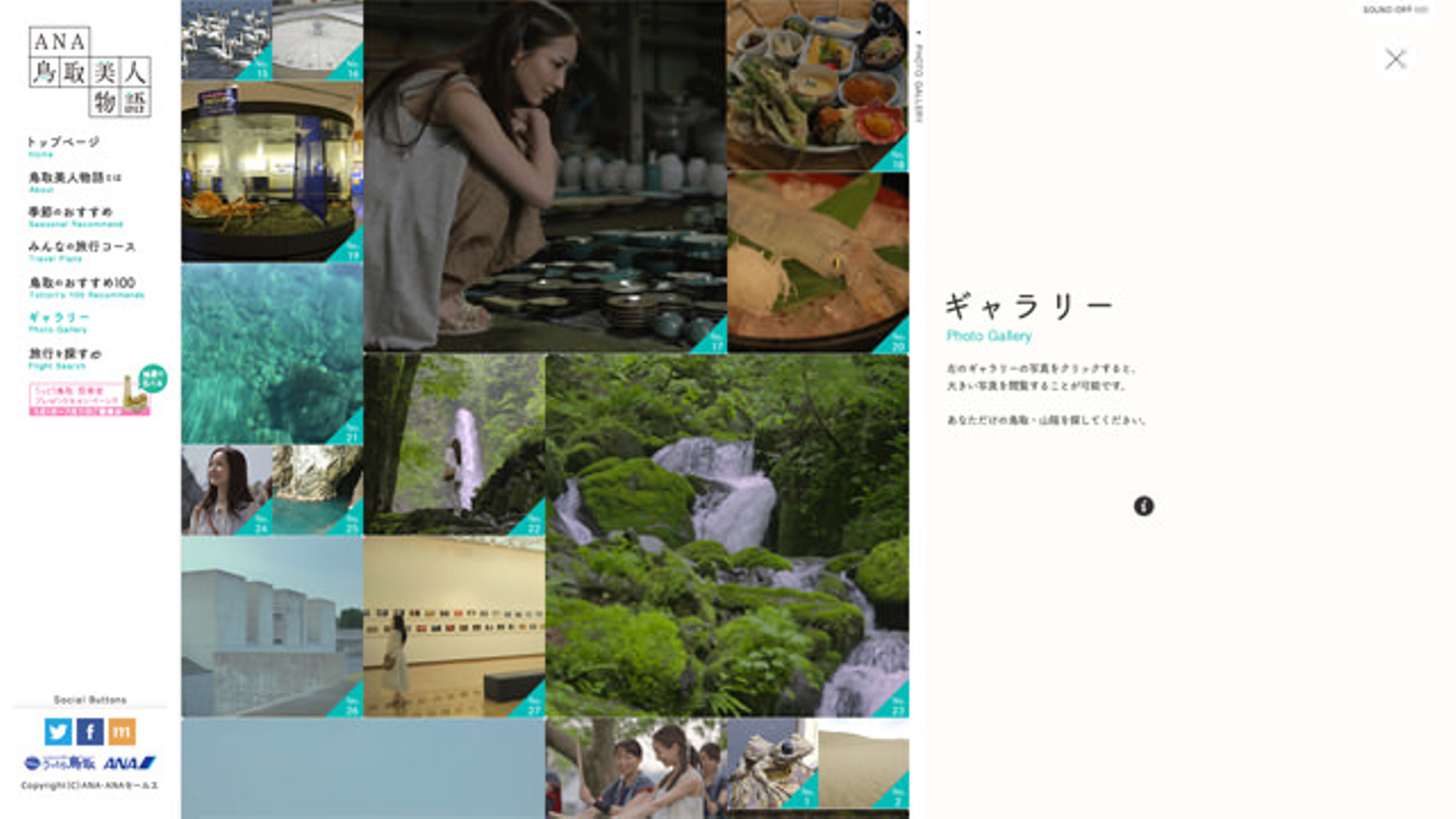 単に写真を掲載するだけではなく、細かな演出・見せ方にも力を注ぎ、BGMやSEを用いて全体としてしっとりとした雰囲気としております。また、スマートフォンサイトにも同様に機能を持たせ、ディスプレイサイズに最適化した写真の見せ方を考慮しました。また、GoogleMaps を利用し鳥取県の観光地やおすすめの店舗などの位置情報を掲載、旅行プランを考えるときにはもちろんのこと、実際に訪れた際にも利用していただけるような作りになっております。