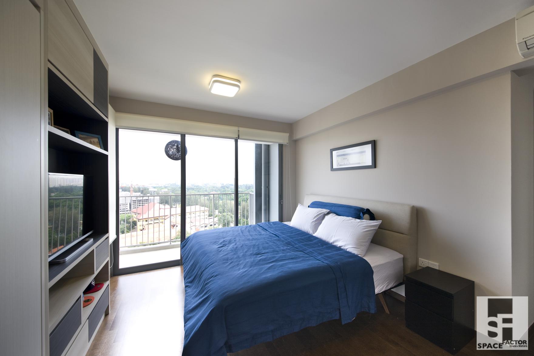 Minimalist and functional elements are a common thread binding both the Scandinavian and Industrial directions and here, functionality can be found in the side table perched conveniently beside the bed and minimalism in the single, cozy, square ceiling light that radiates from the ceiling.
