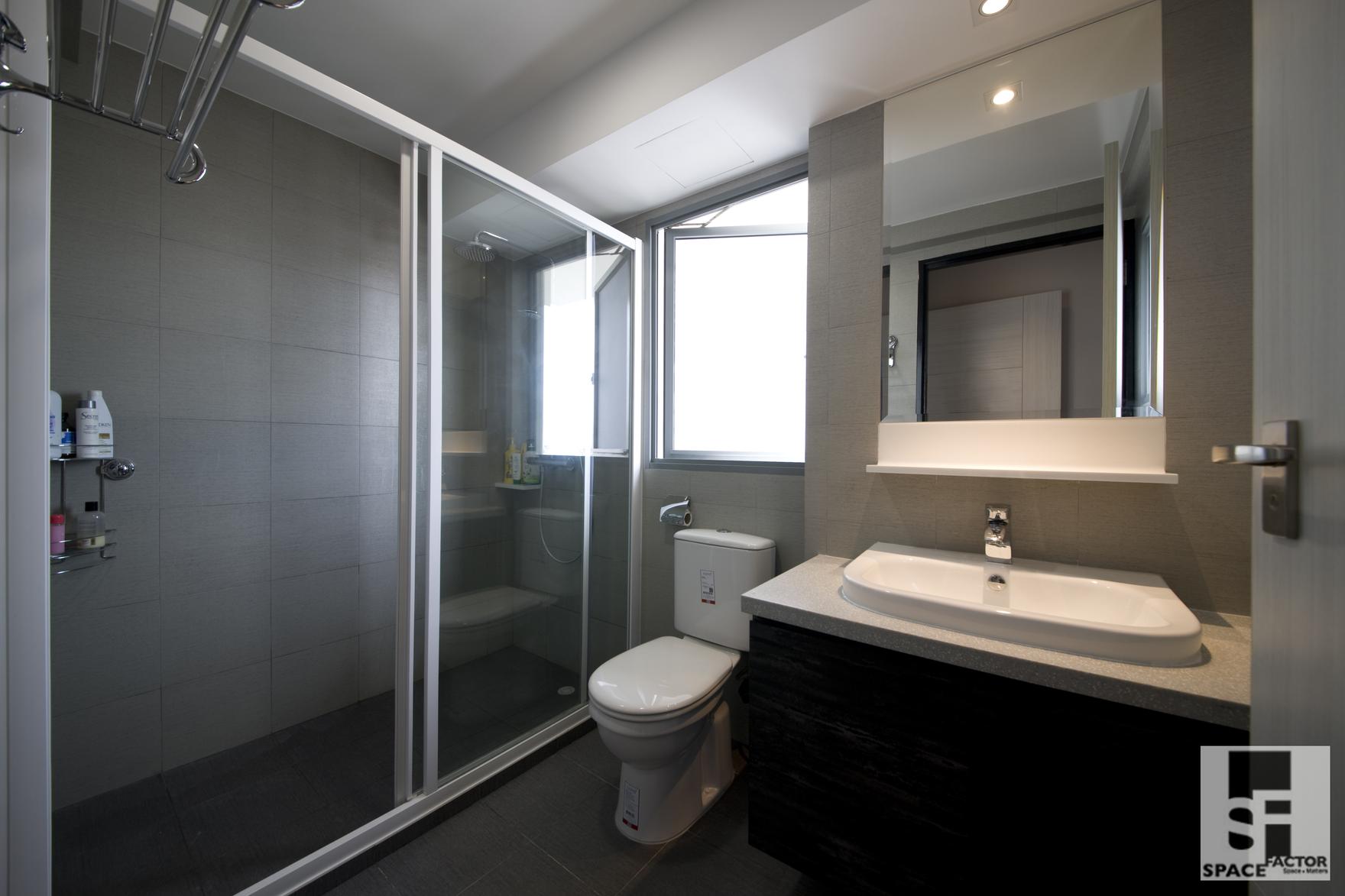 Clean, spacious and highly functional, the space utilizes a large, glass sliding panel to segregate both the wet and dry parts of the bathroom.