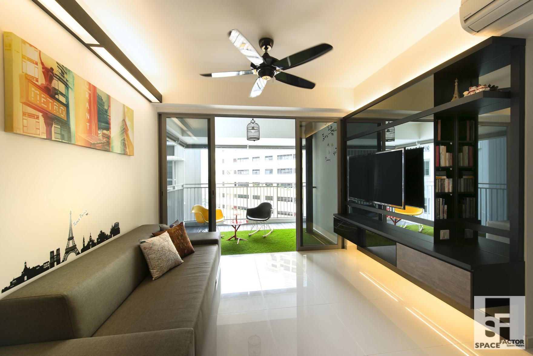 The reflective panes that adorn the paneled television console guide the viewer towards the sliding doors leading out into the balcony. The use of reflective material also helps open up the space and make it appear larger than it actually is.