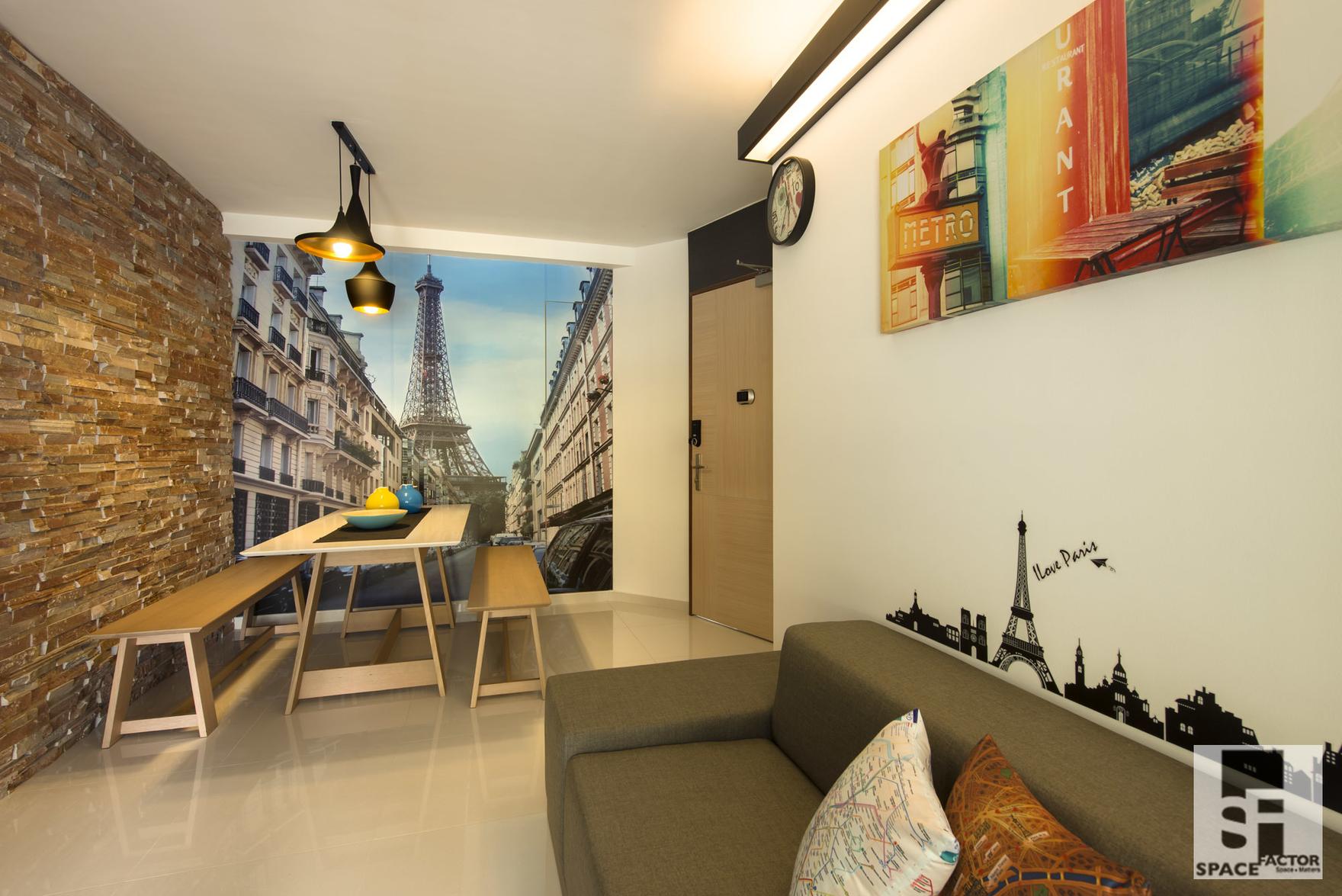 A light and easy vibe permeates the home. The iconic Eiffel Tower can be found almost everywhere here as portraits, stickers and other graphical elements bring the living room to life.