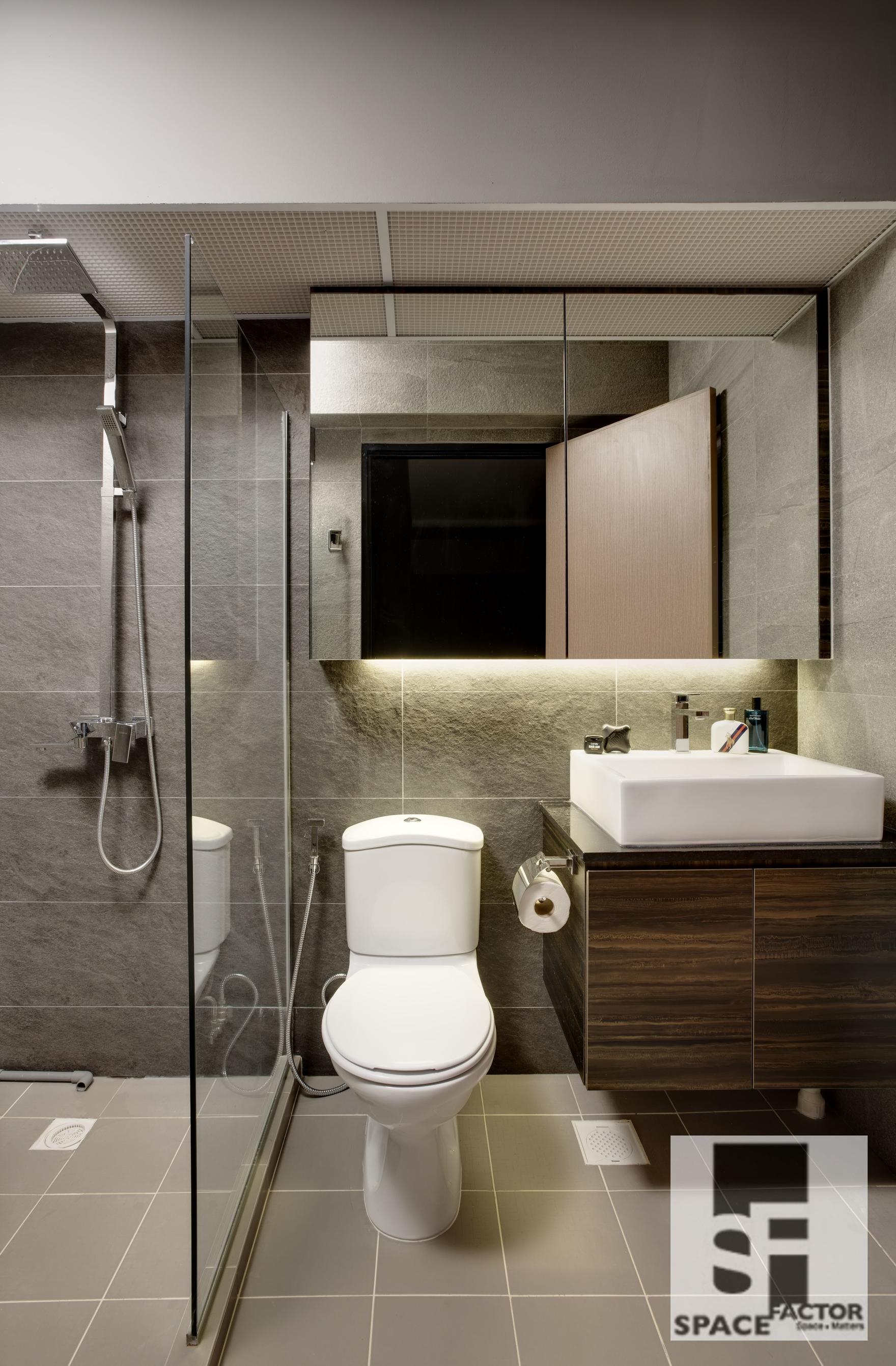 The bathroom was fitted with a panned glass to segregate the shower area while 2 large mirrors, a neatly functional sink, smooth wooden cupboards and concrete colored tiles enhance the overall experience.
