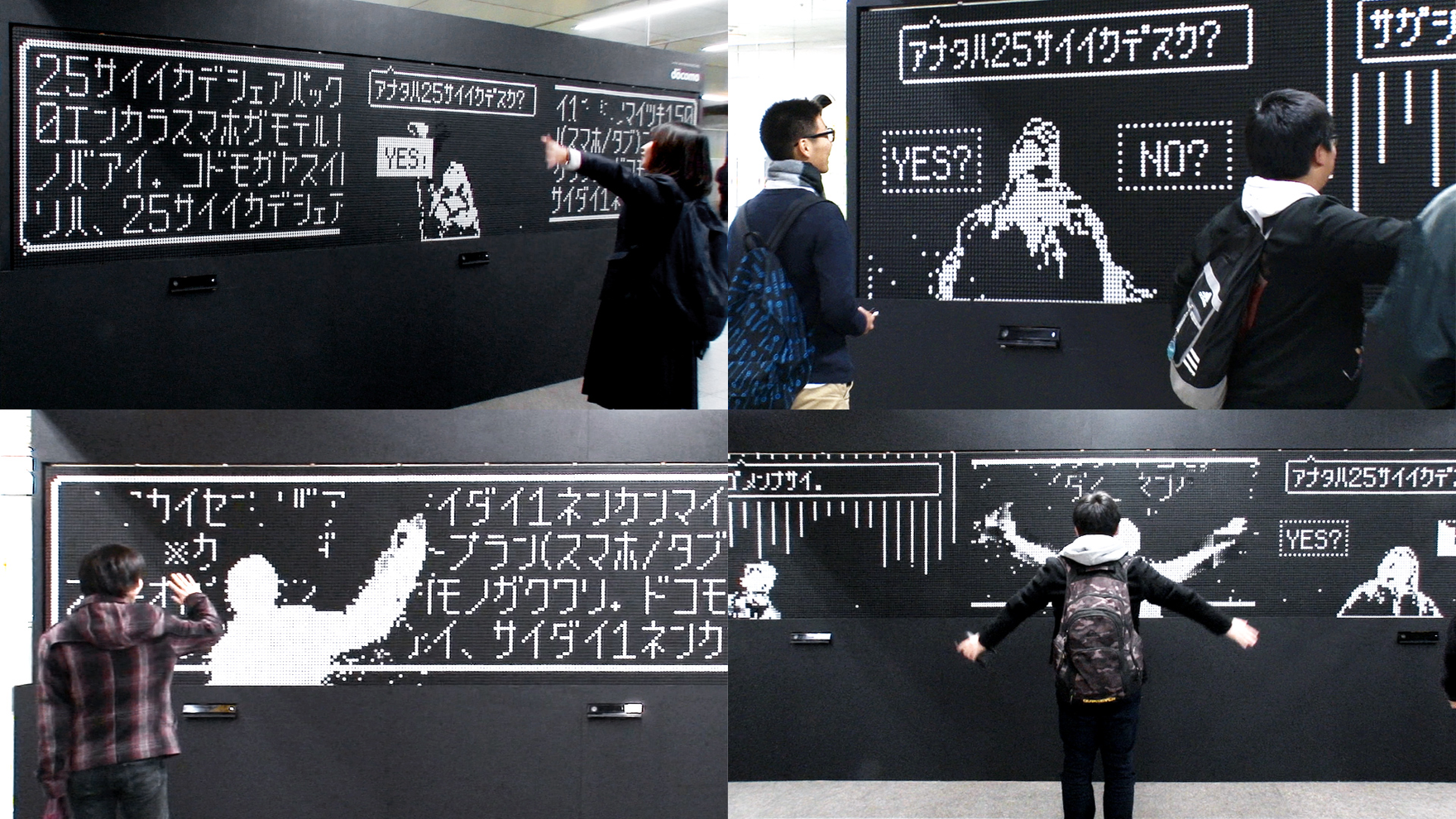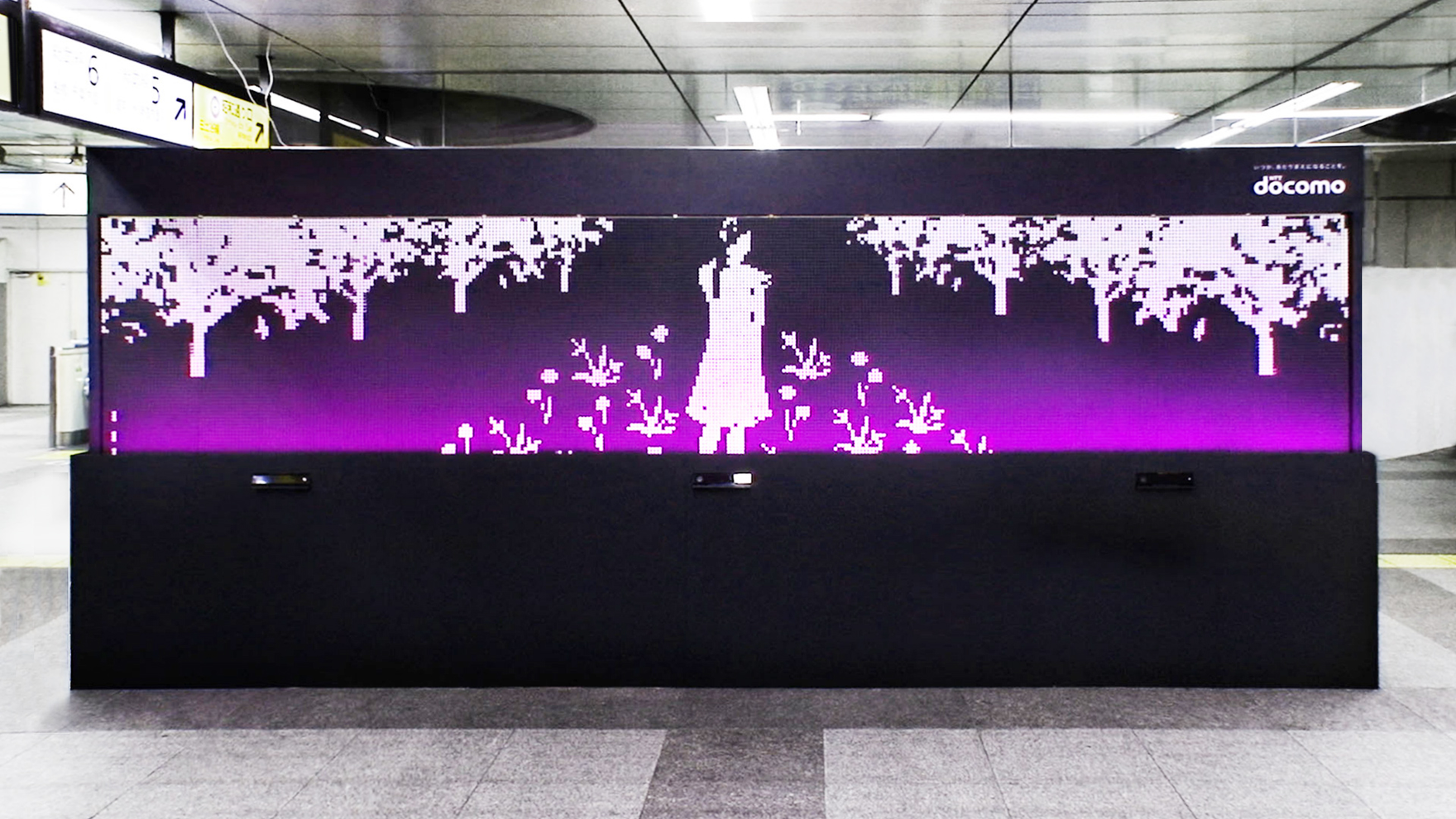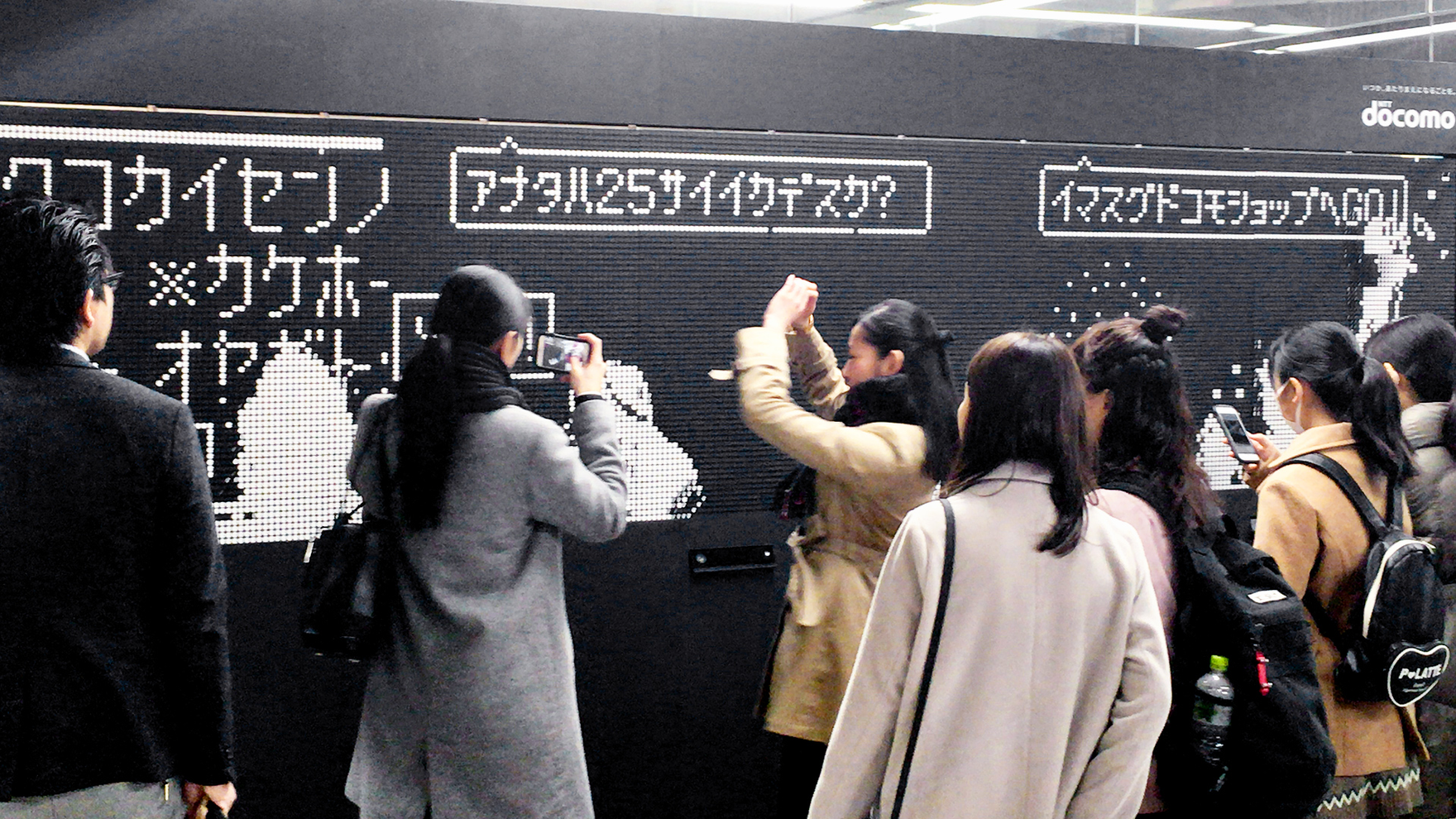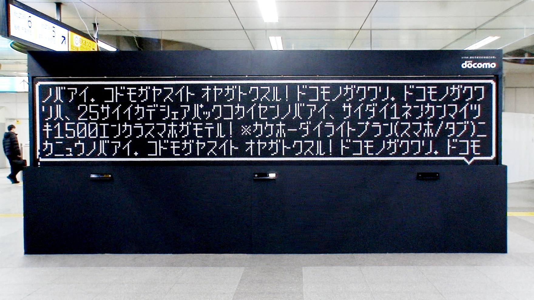 「ドコモの学割」キャンペーンでは、長さ約6メートルのFLIP-DOTSをJR秋葉原駅構内に設置しました。学割キャンペーンの詳細内容を記した文字を崩して遊んだり、フリップドッツに自分の顔が表示されるなどのインタラクションを体験することができます。