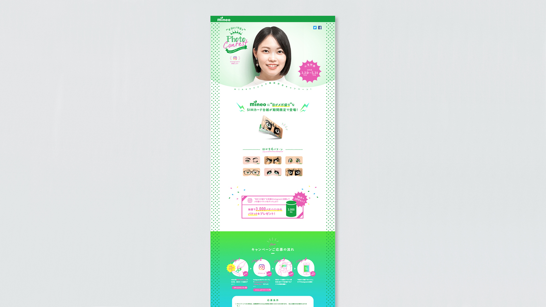 格安スマホサービス「mineo」のSIMカード台紙を企画提案・制作しました。同時に実施されたInstagramフォトキャンペーンのキャンペーンサイトも制作。ユーザーから多くの“メガ盛り写真”が投稿されました。