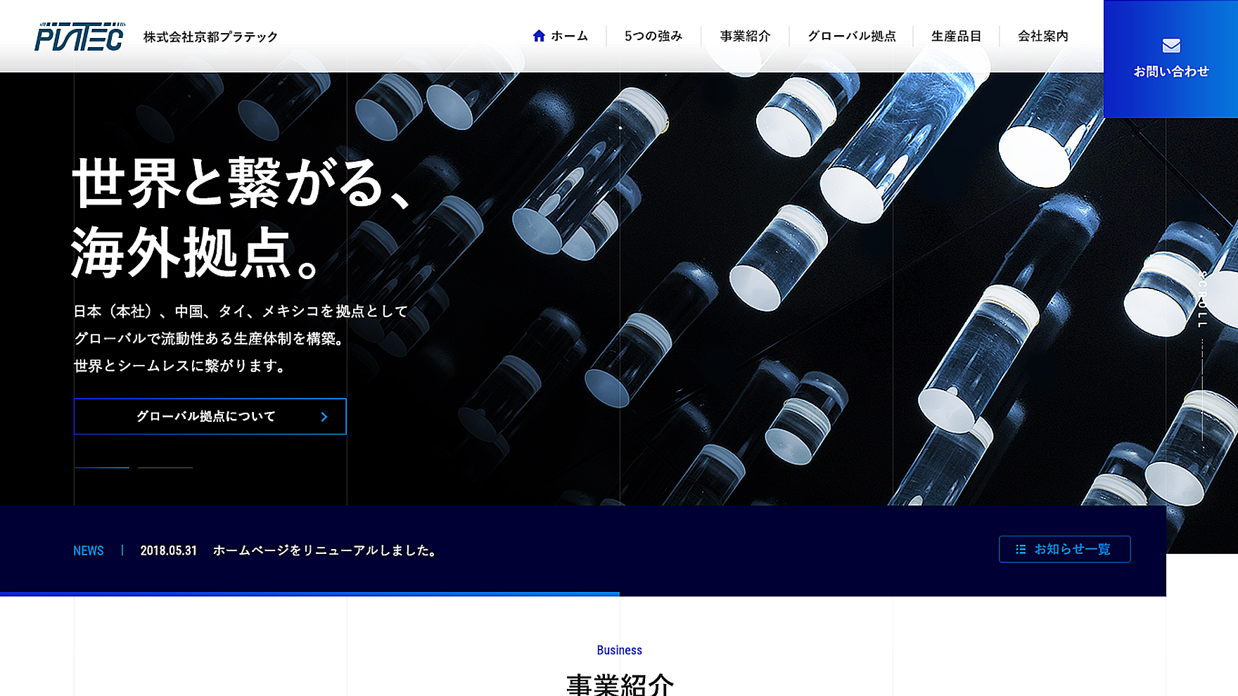 設計から社内一貫体制で行う「ものづくりのトータルプロデュースメーカー」であり、「グローバル拠点を持つ」ことを強みとしてアピール。先進性・緻密さを印象付けるデザインで、生産を主軸とした「ものづくりメーカー」のイメージから脱却するサイト設計を目指しました。