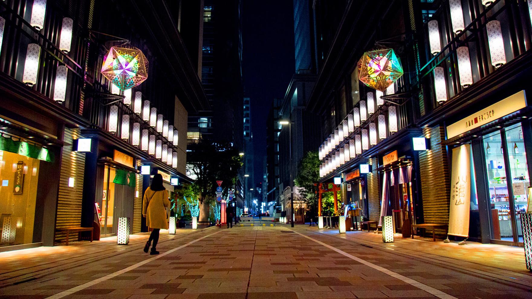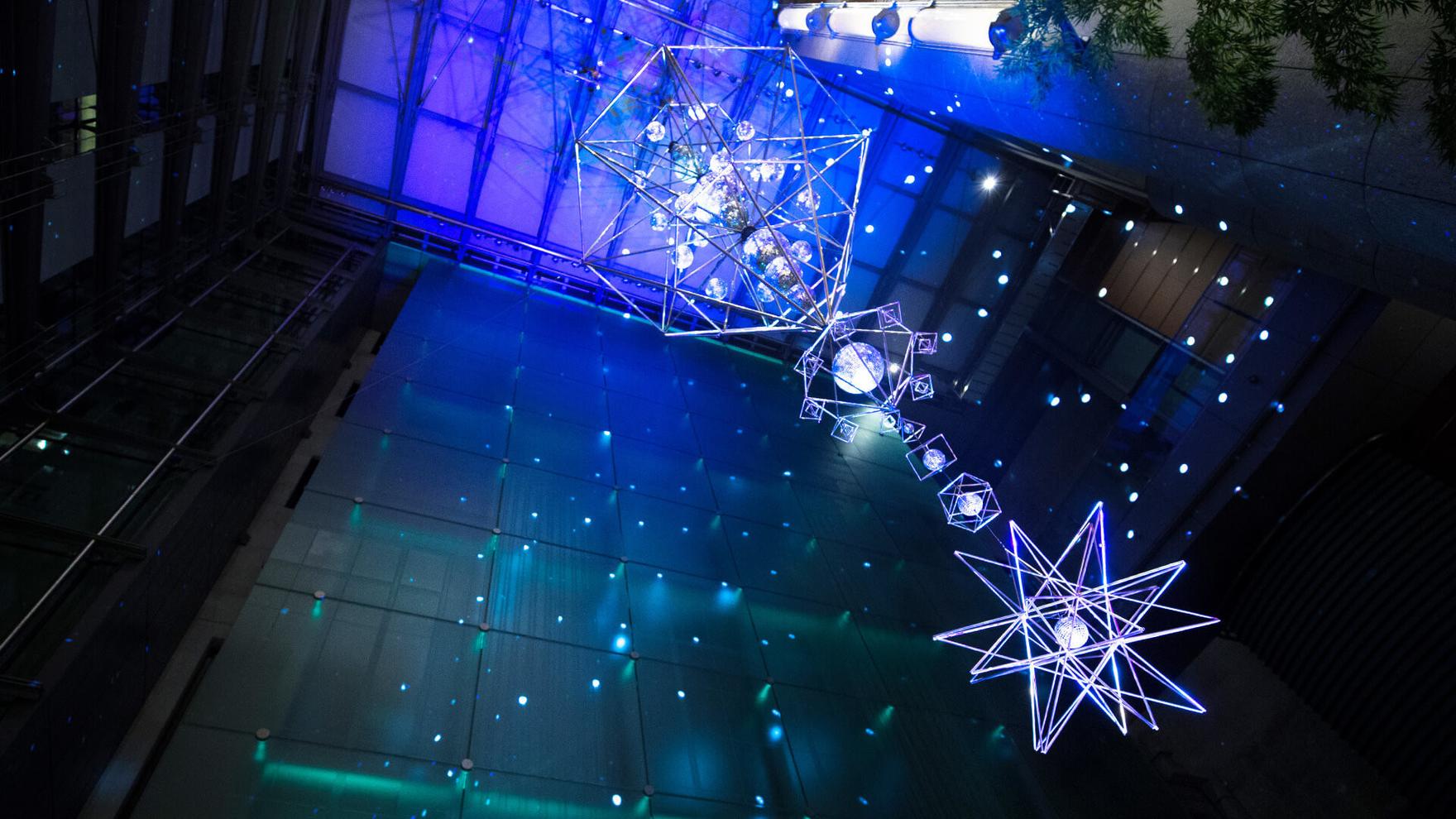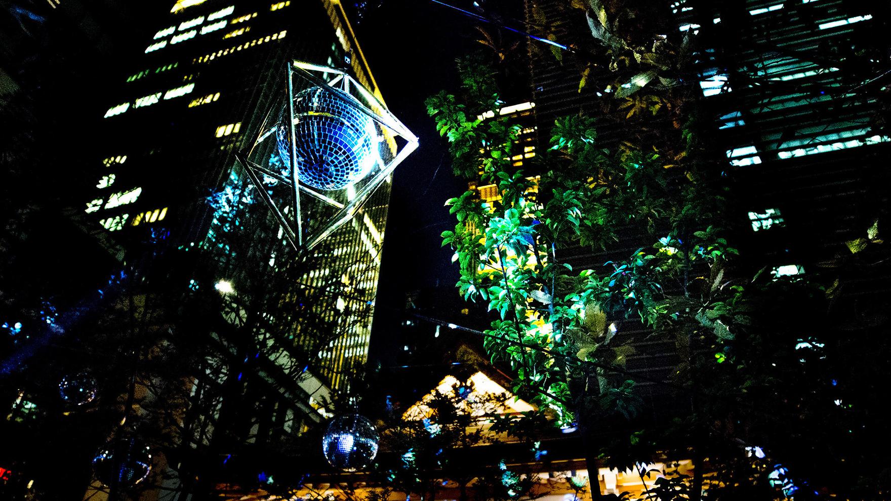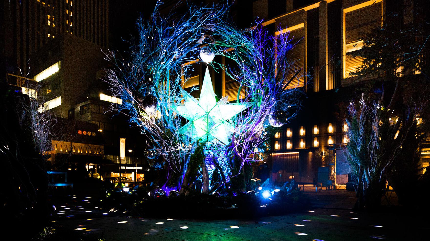 福徳の森では、昼間でも目を引く「シンボルツリー」と周囲の木々につるされた無数のミラーボールを、三井タワーでは、ダイヤ型の中に天体のようにミラーボールが浮き、高さ14メートルのスケールの大きなアートが楽しめる「スターフォール」と、異なる印象の流星連動アートを用意し、日本橋の冬の夜に彩りをそえました。