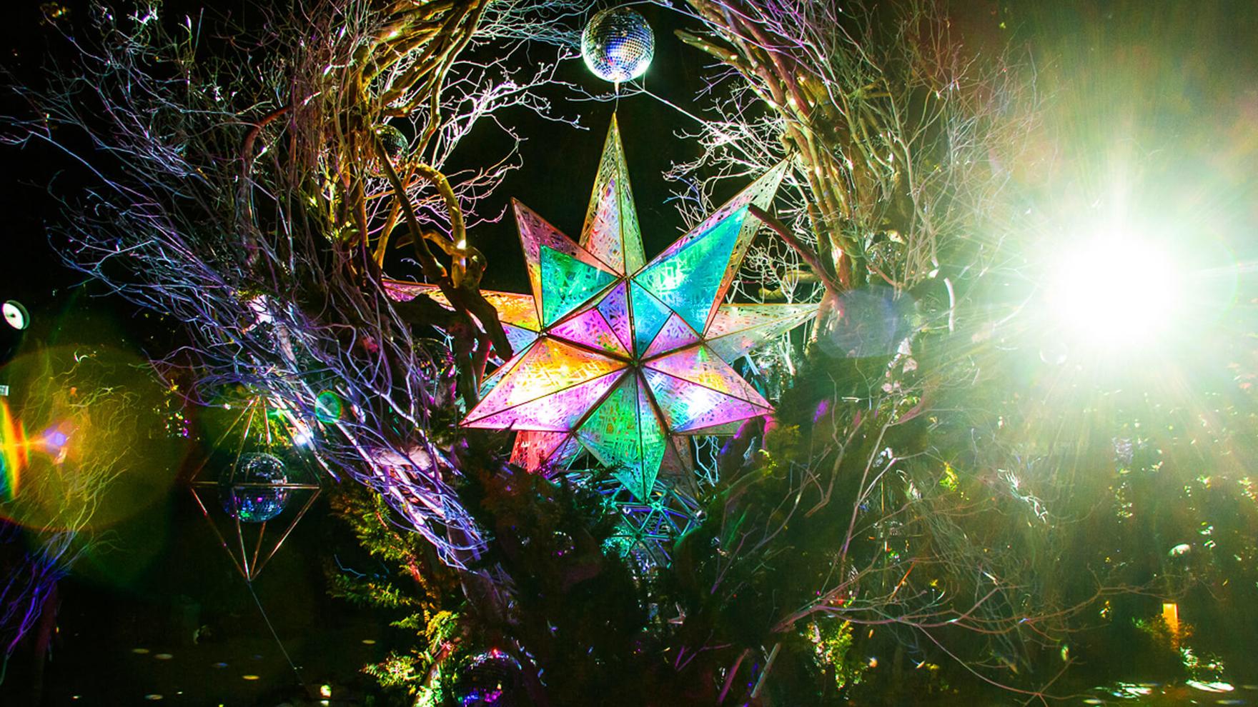 今年は、無数のミラーボールを使用して光と反射の空間作品を創りだすアート集団「mirrorbowlers」と初コラボ。流星観測システム「MeteorBroadcaster」を使って日本上空に出現した流星を観測、検知した流星情報に応じて、森を染め、ミラーボールを照らすライティングの光量・動き・色を制御し、流星とミラーボールが共鳴しあう幻想的な空間を創り出しました。