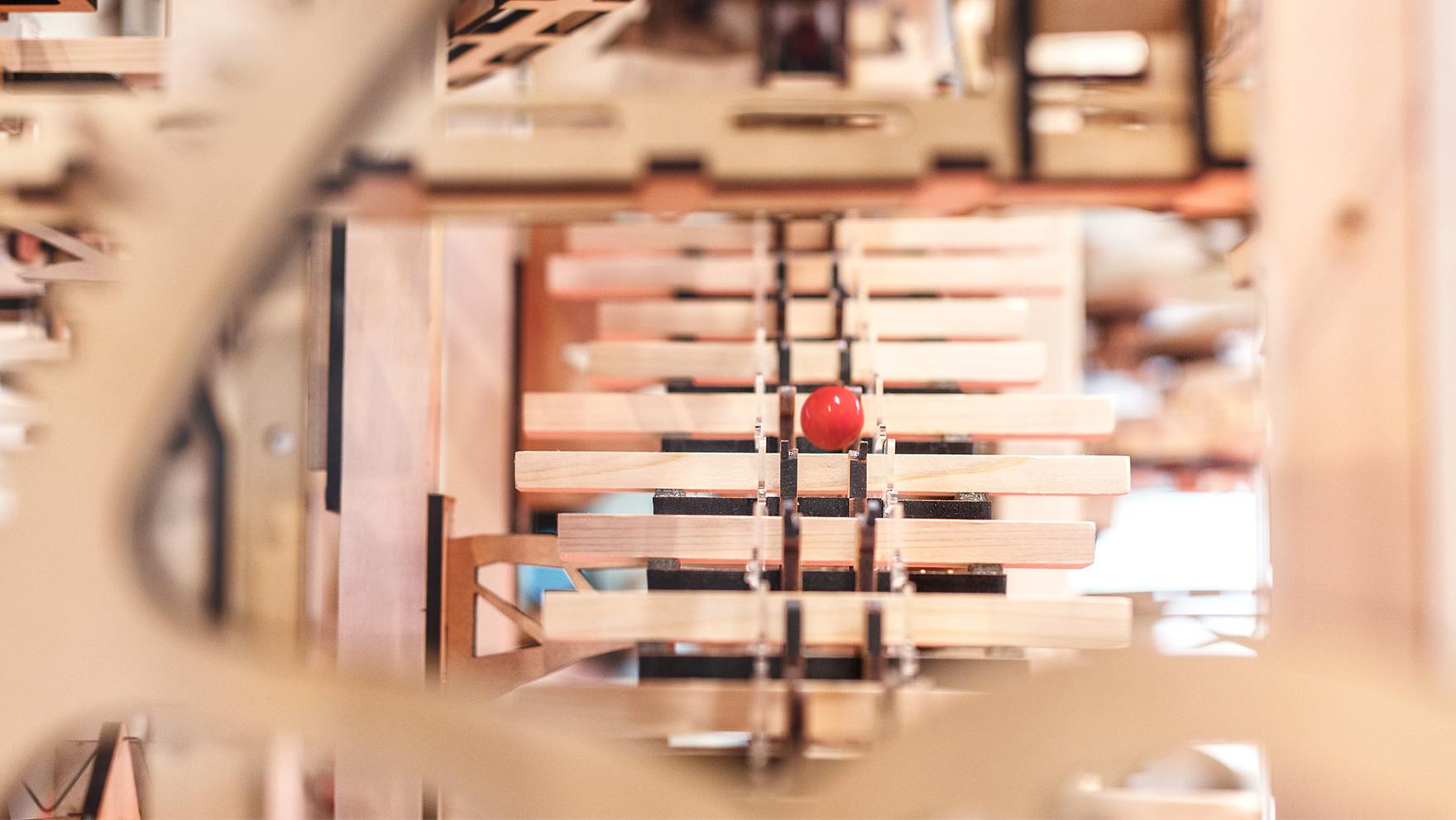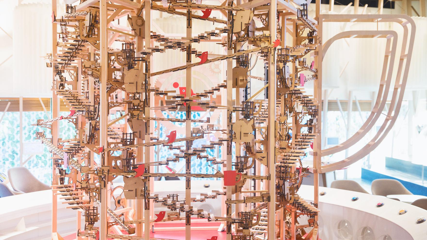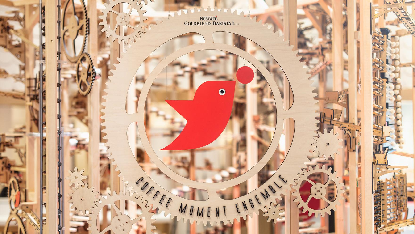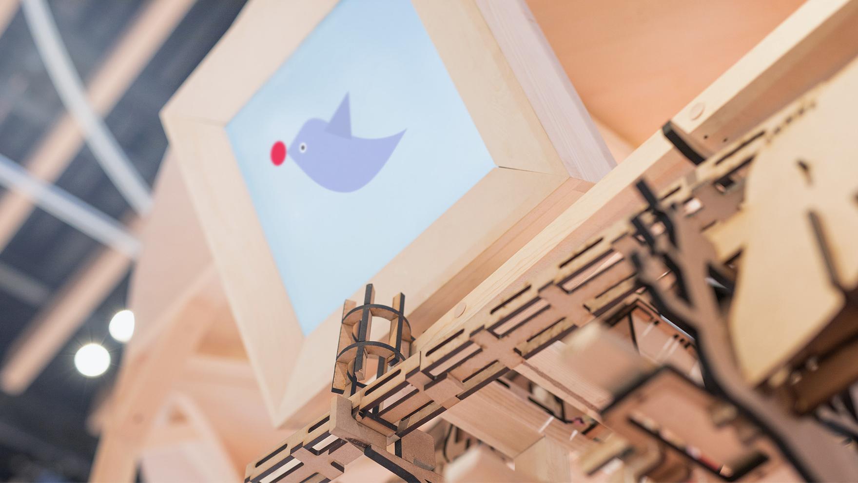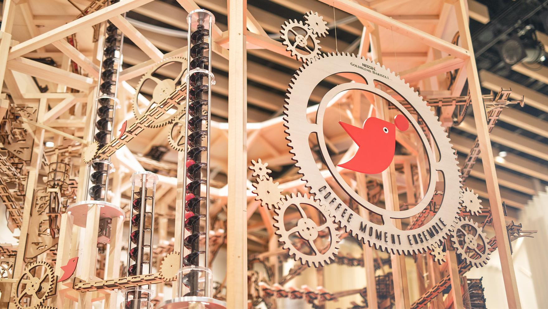 お客様がバリスタ i でコーヒーを淹れると、会場のスクリーンの中でかわいい小鳥が生まれ、コーヒーモーメントを表す赤い玉をくわえてピタゴラ楽器のほうに飛んでいきます。小鳥が赤い玉を落とすと、その玉はリアルな玉に変化し、階段状に並んだ木琴の上をコロコロと転がり、楽しい仕掛けを通り抜けながら、クリスマスの音楽を奏でます。