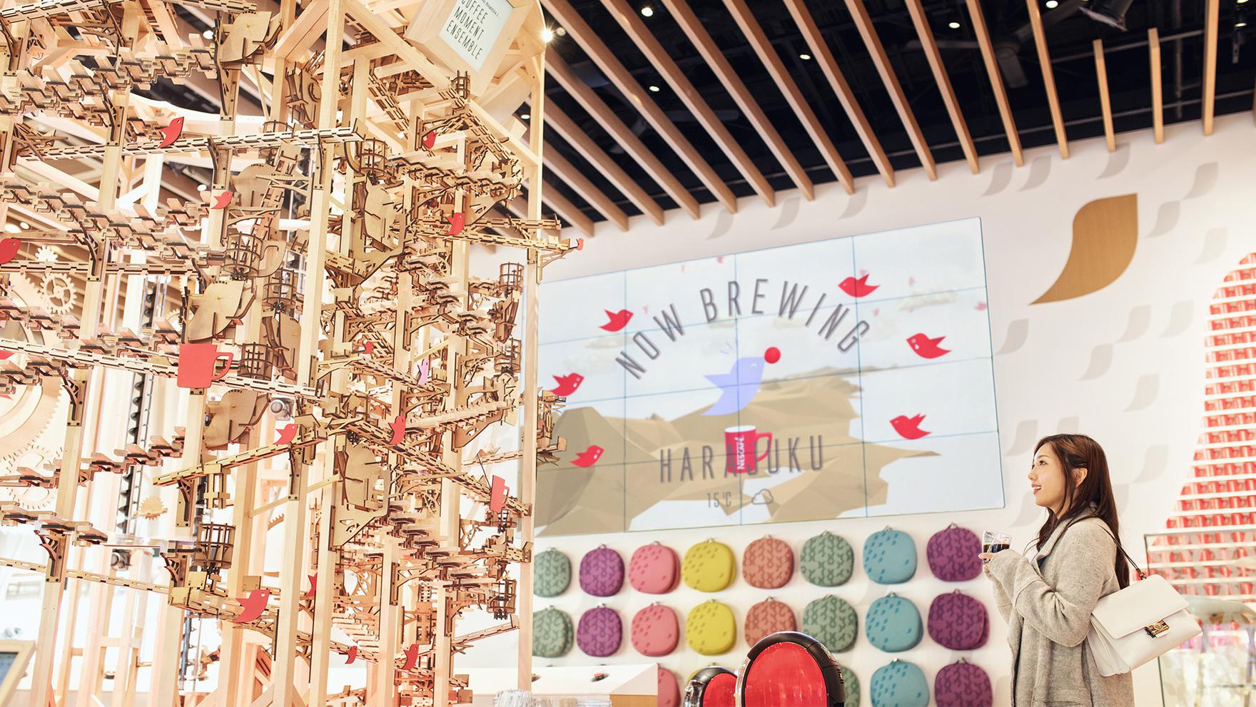 コーヒーモーメントでつながる楽しさを体験してもらうために、デジタルとアナログをシームレスに組み合わせた体験装置を開発。まず、コーヒーログを音楽に変換する高さ3.5mの大きなマグカップ型の”木製ピタゴラ楽器”を5ヶ月かけて制作。また、全国のコーヒーログをリアルタイムビジュアライズしたスクリーンコンテンツも開発。これらをクリスマスシーズンの時期にネスカフェ原宿に設置し、特別な空間を生み出しました。