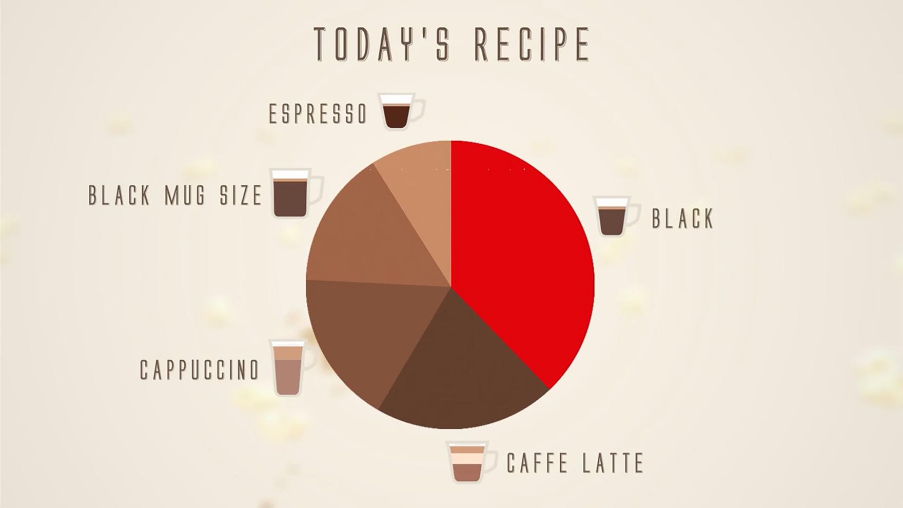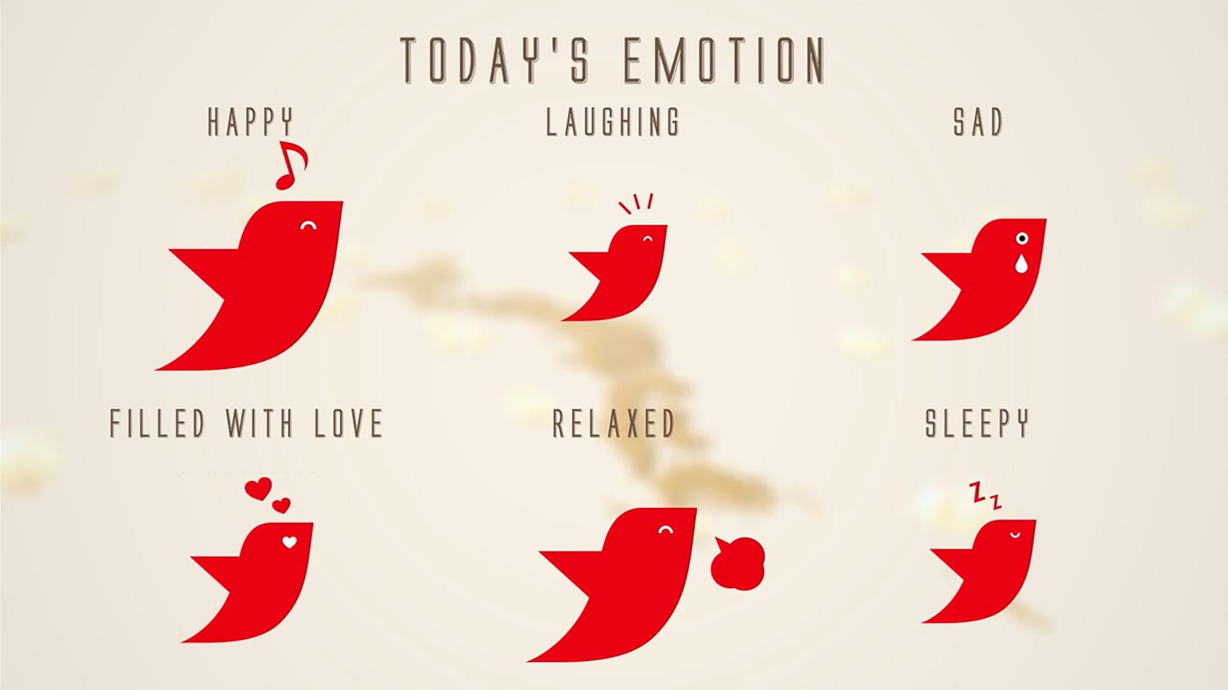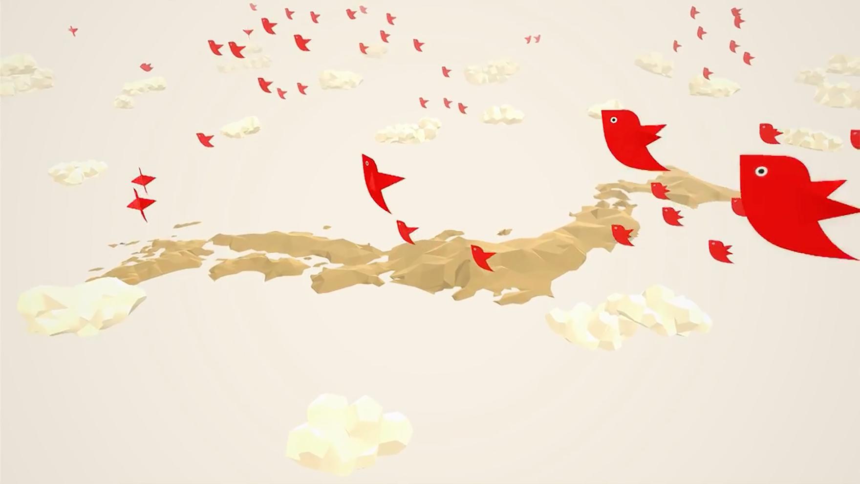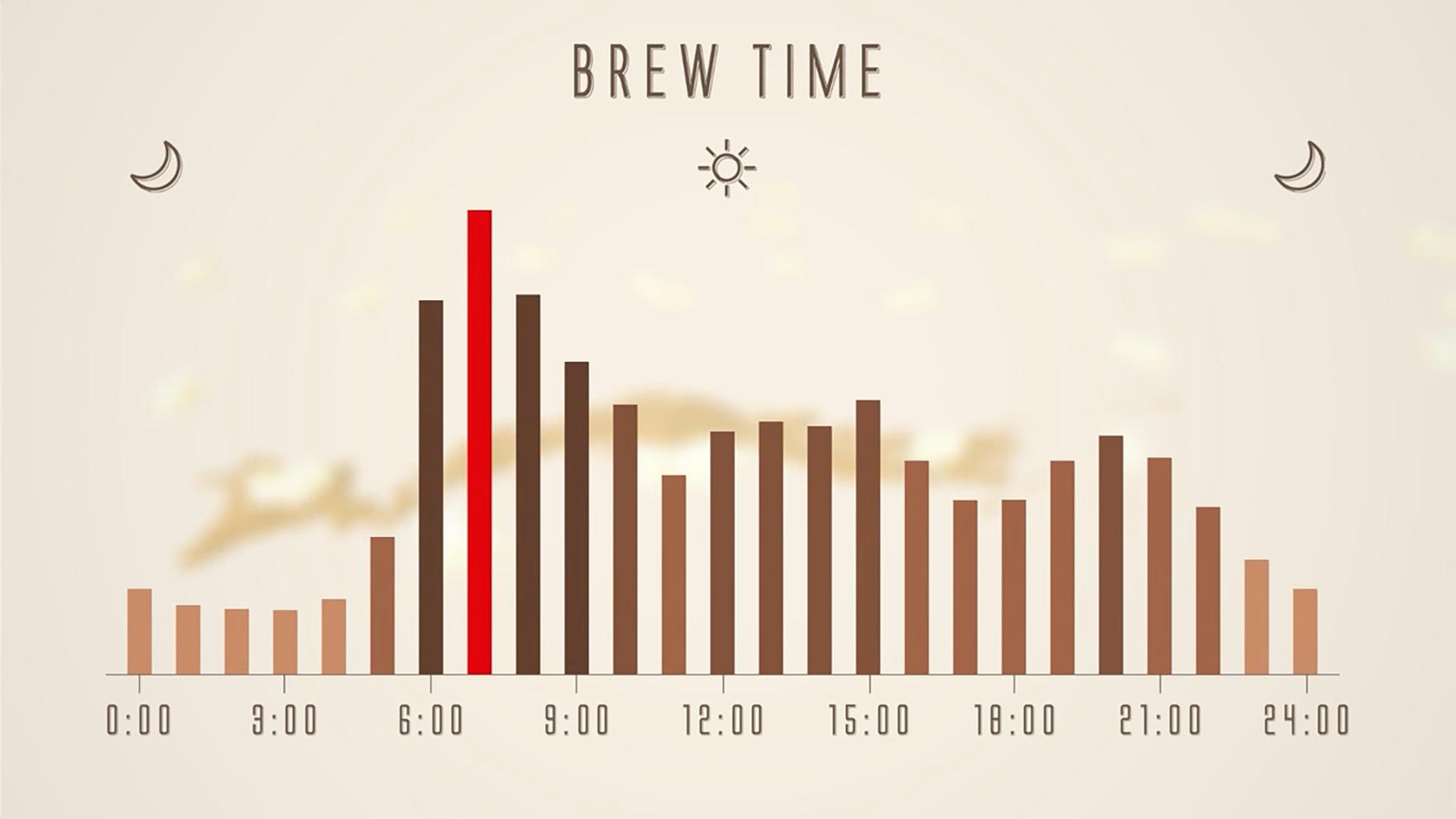会場の大きなスクリーンでは、バリスタ i を使って日本中でコーヒーが淹れられている様子をビジュアライズ。日本のどこかで誰かがコーヒーを淹れると、3D地図の該当する県から、リアルタイムに小鳥が飛び立ち、ピタゴラ楽器を少しだけ鳴らします。どの時間帯に、どんな気持ちで飲まれているか、統計データも表示しました。