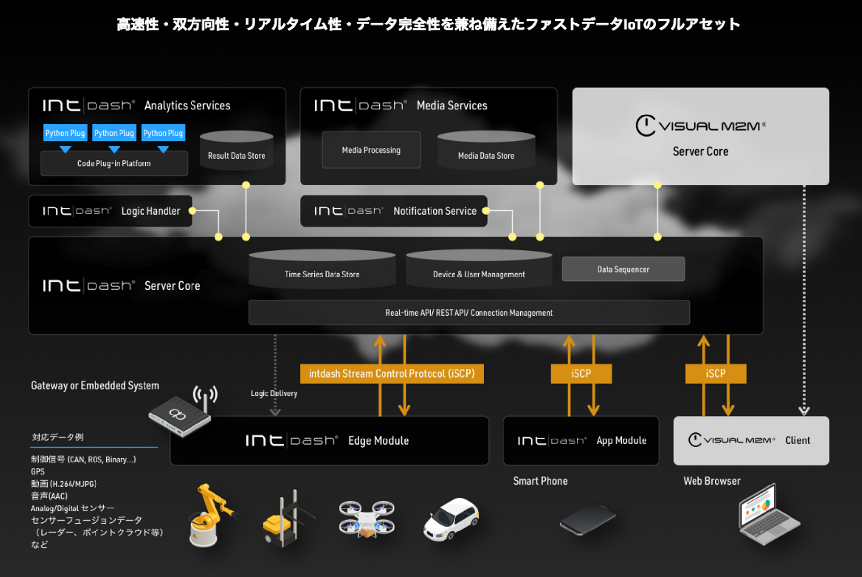 intdashは、100ミリ秒∼1ミリ秒間隔程度の高頻度で発生する時系列データを品質保証のないネットワークを経由して、高速・大容量かつ安定的にストリーミングするための双方向データ伝送プラットフォームです。 intdashは、プラットフォームを構成する製品・サービスの総称(ブランドネーム)を兼ねており、INTeractive DAta Streaming Hub の頭文字を並べた略称です。
