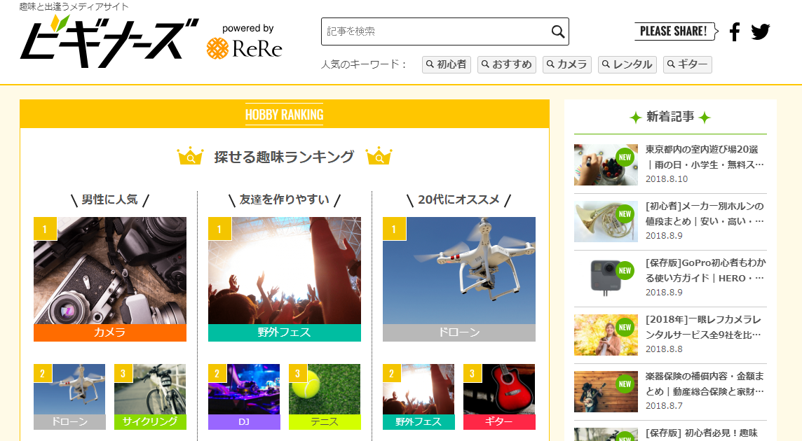 趣味と出逢うオウンドメディア「ビギナーズ」では、趣味にまつわる情報を掲載するだけでなく、趣味を始めるにあたって必要な道具をまずレンタルで「試し利用」することを提案し、レンタル事業とのシナジーを生み出しています。