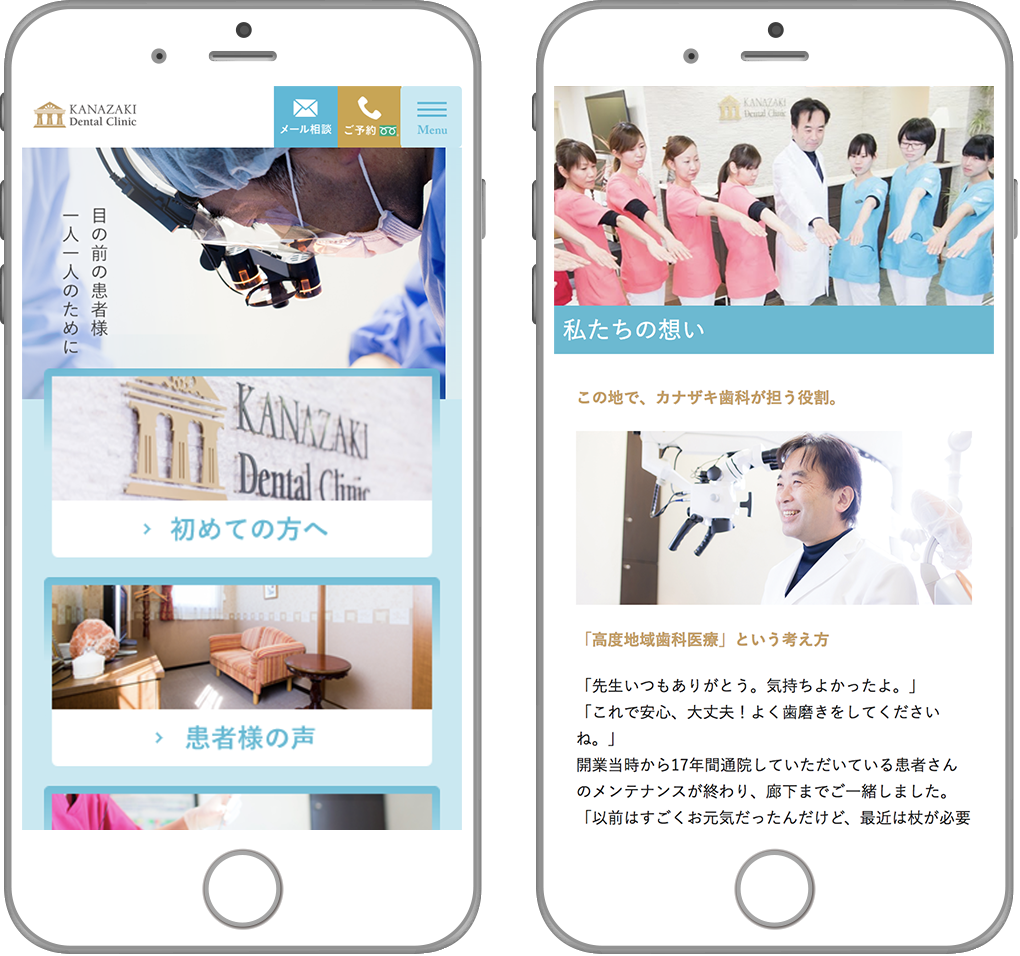 最初にカナザキ歯科様のウェブサイトを弊社で構築させていただいたのが2008年頃で、その後も継続的にコンテンツを追加されていきながら10年程が経過。コンテンツ量は増えたものの、アクセシビリティやスマートフォンユーザーの増加に伴うデザイン・UIの変更は急務の状況となっていました。