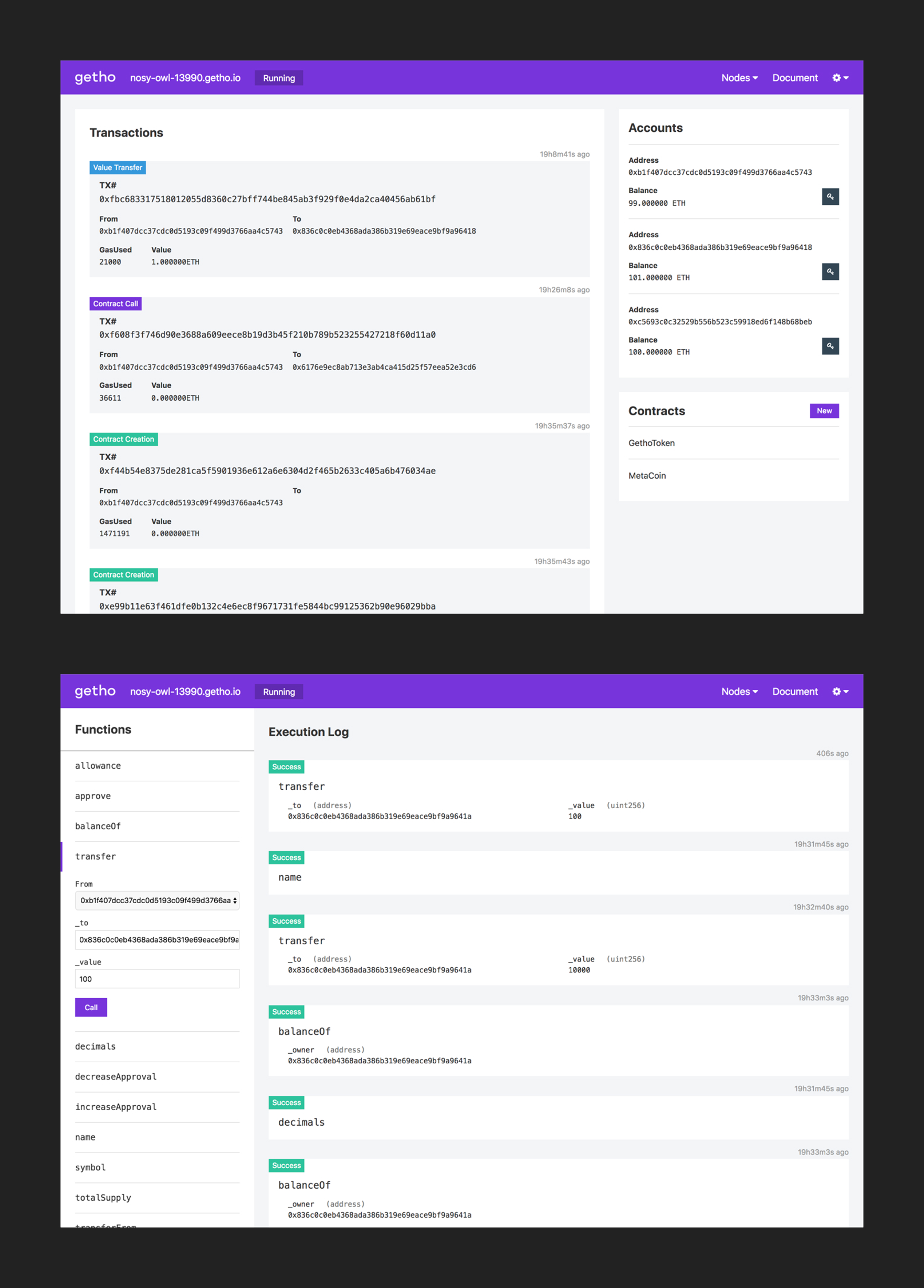 getho(ゲソ)は、DApps開発に必要不可欠な機能を持ち合わせた開発者支援プラットフォームです。gethoを使えば、プライベートノードの立ち上げや、Webデバッガーを利用したスマートコントラクトの実行とテストなどを行うことができます。世界中の全てのDApps開発者にとって必要不可欠な開発支援プラットフォームを目指します。