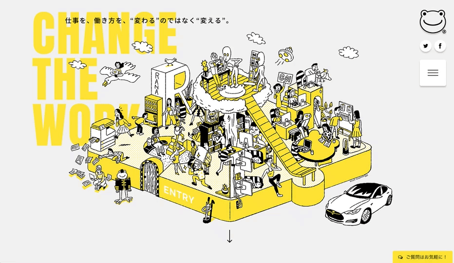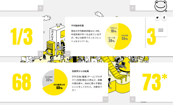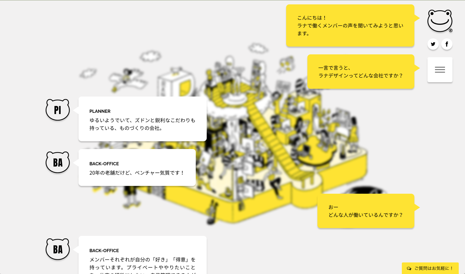 社内のにぎやかな雰囲気と様々なスタイルで働く様子をイラストレーションで表現。ページをスクロールするごとに現れるコンテンツは、インタビュー記事、メッセージアプリ風のコメント、インフォグラフィックスと全て演出を変えてラナデザインからの熱いメッセージを楽しんで見ていただけるようにしました。